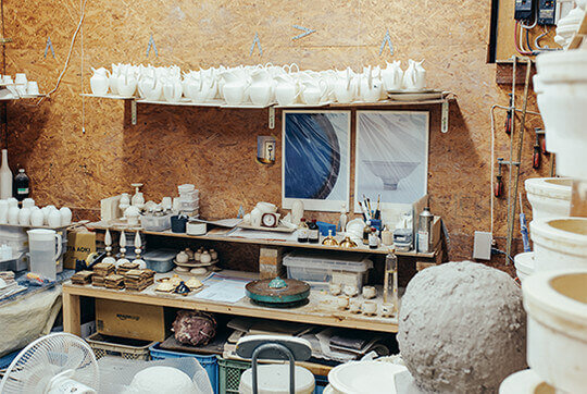 Once inside the studio, the visitor’s gaze is drawn towards the numerous test pieces covering the walls: Elegant white porcelain tiles, tableware glazed with gold or platinum enamel, gleaming like multi-colored precious stones, and pieces reminiscent of bare mountain terrain, coated over with designs that bring to mind the powers of nature. As we admire these intricate works, we are left with no doubt that we have entered the birthplace of the many and varied wares of Aoki.