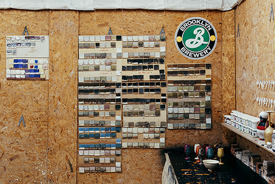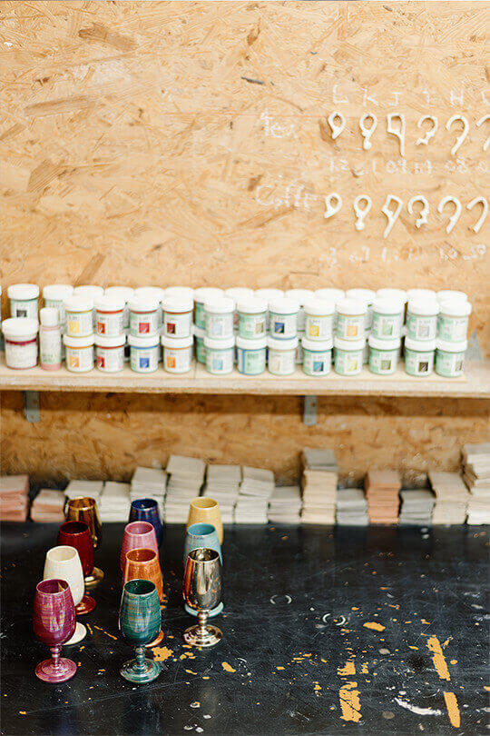 The walls are covered with test pieces on which the artist tries out different glazes.