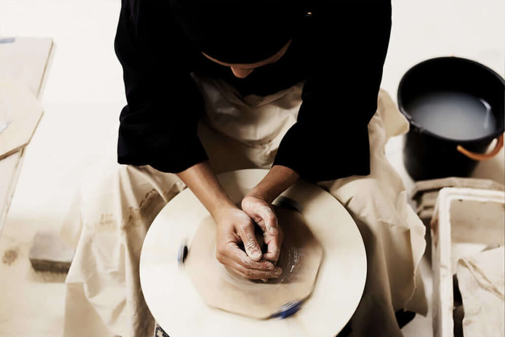 The hands of the artist, Ryota Aoki. He turns the wheel in his workshop, where rap music is playing at full blast.