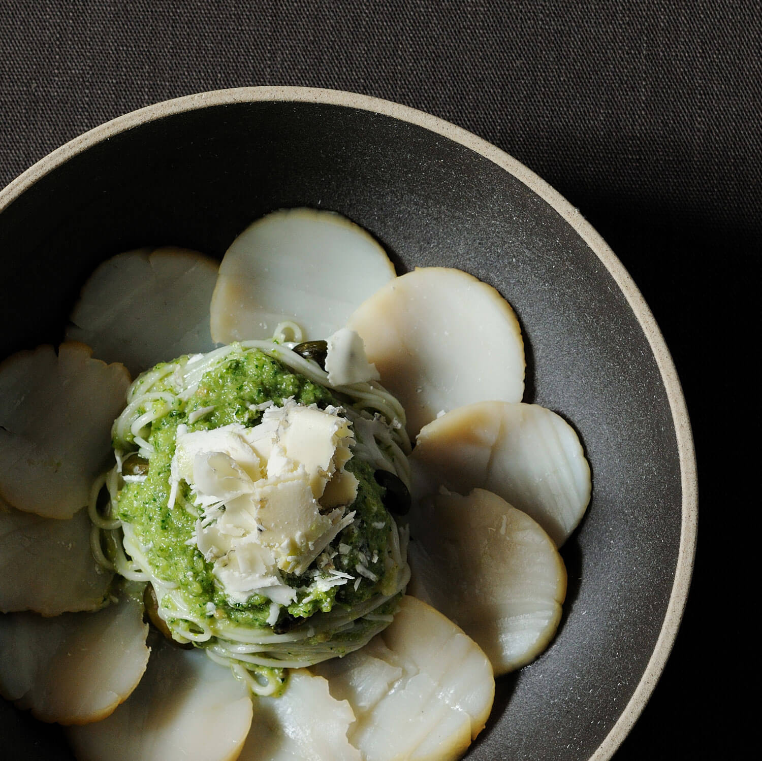 Smoked Scallops, Somen with Watercress Pesto, Sainte-Maure Cheese