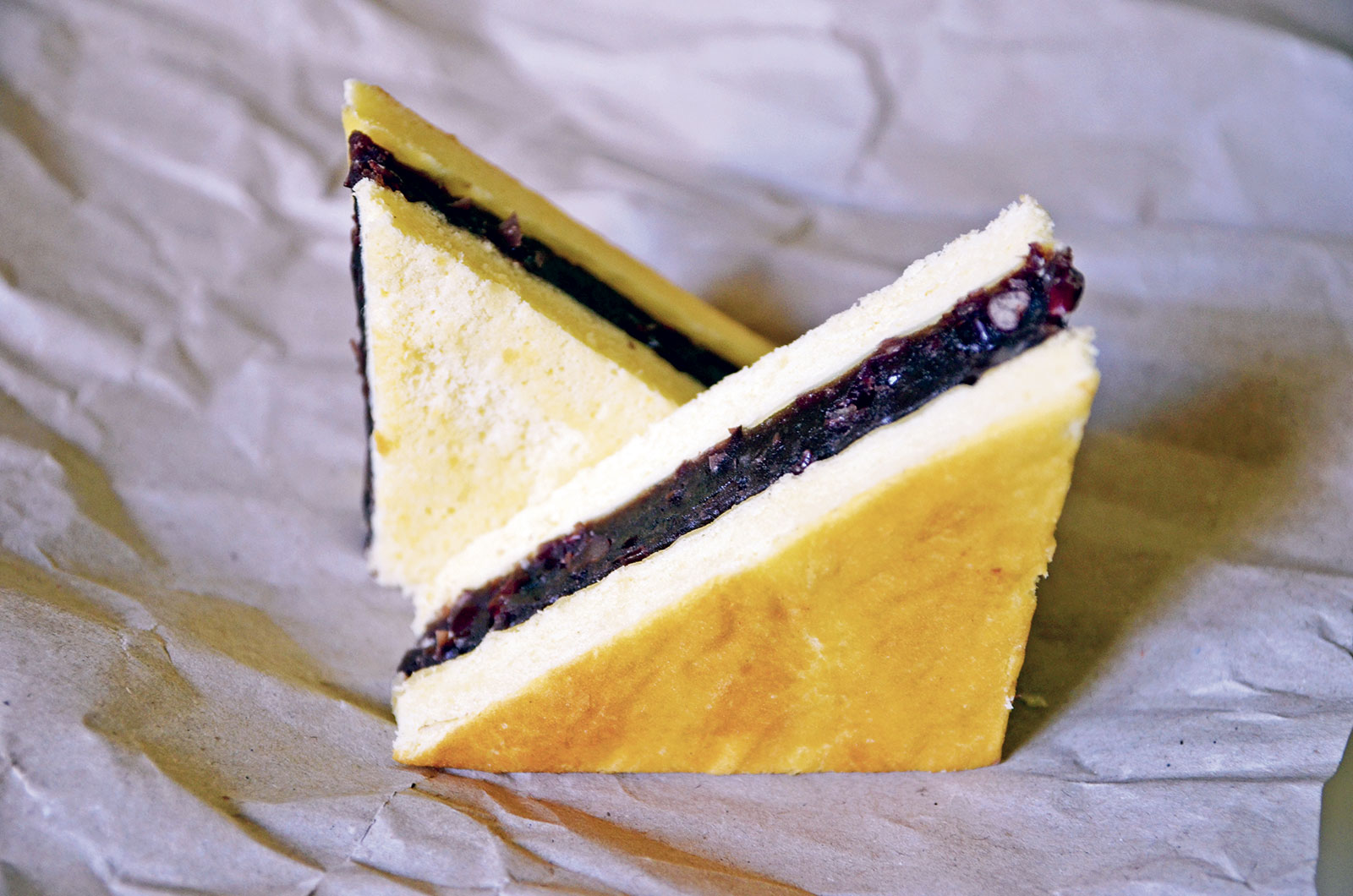 Cut the cake in half, then spread the red bean paste on one of the halves in a uniform manner. Place the other half on top, exposing the more golden side, and place the whole thing in the fridge for four hours.