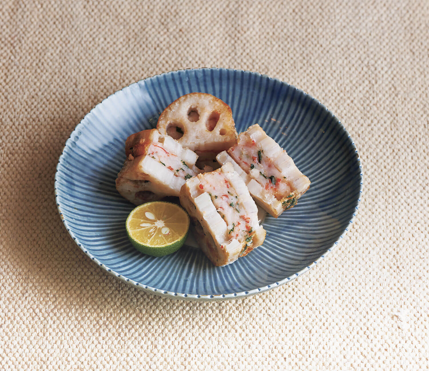 This is replaced by large slices of lotus root, covered in cornstarch before frying. They are filled with pink shrimp paste, the flavour of which is lifted by ginger juice and shiso leaves, also known as Japanese parsley.