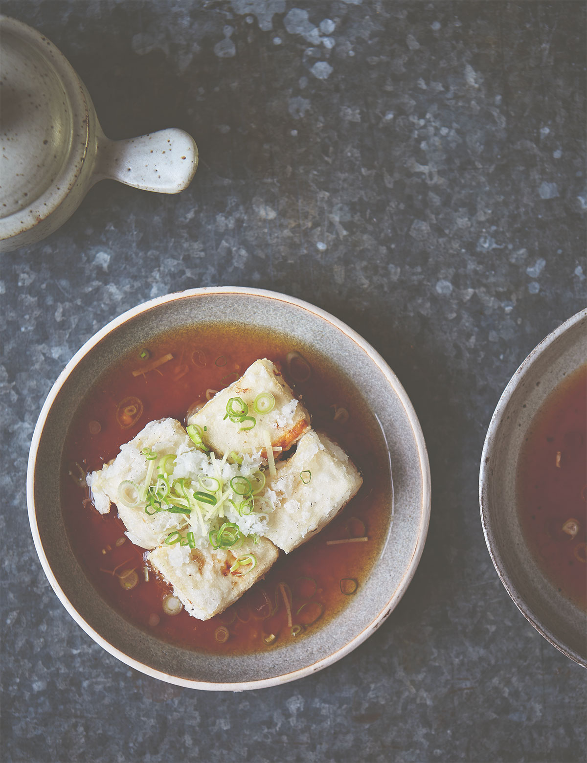 Tim Anderson designed this dish composed of fried tofu with dashi to please lovers of light Japanese cuisine. In the introductory text to this recipe taken from his book Vegan JapanEasy, the chef declares: ‘it’s difficult to find anything lighter and more delicate than these clouds of fried silken tofu, crispy on the outside and soft like a pillow on the inside.’