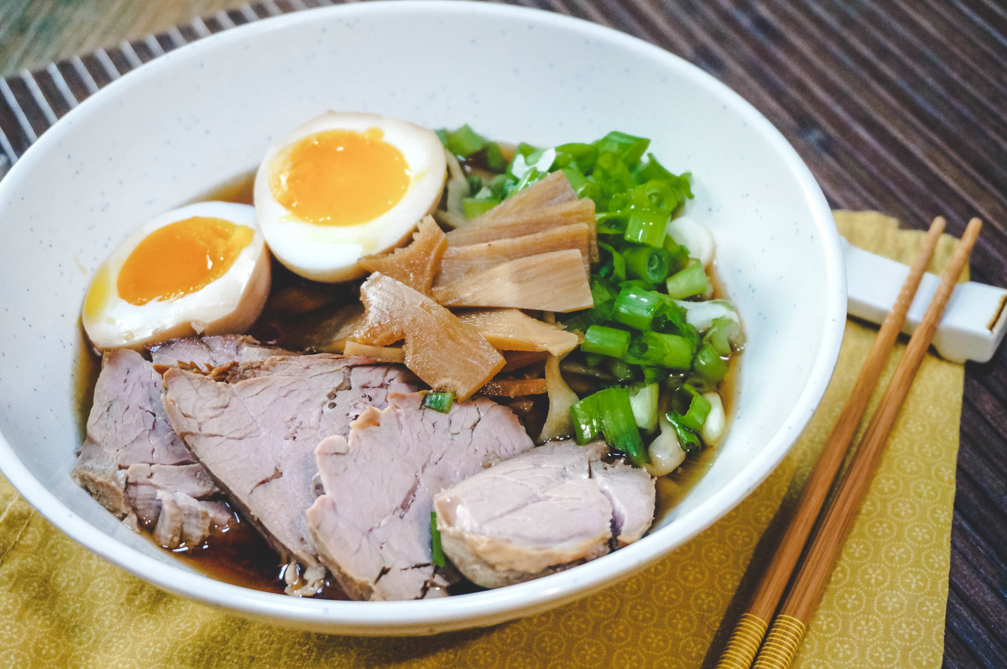 When ready to serve, cook the ramen following the instructions on the packaging. Divide the broth into six bowls, then add the noodles, pork, bamboo shoots, soy-marinated eggs, and green onions.