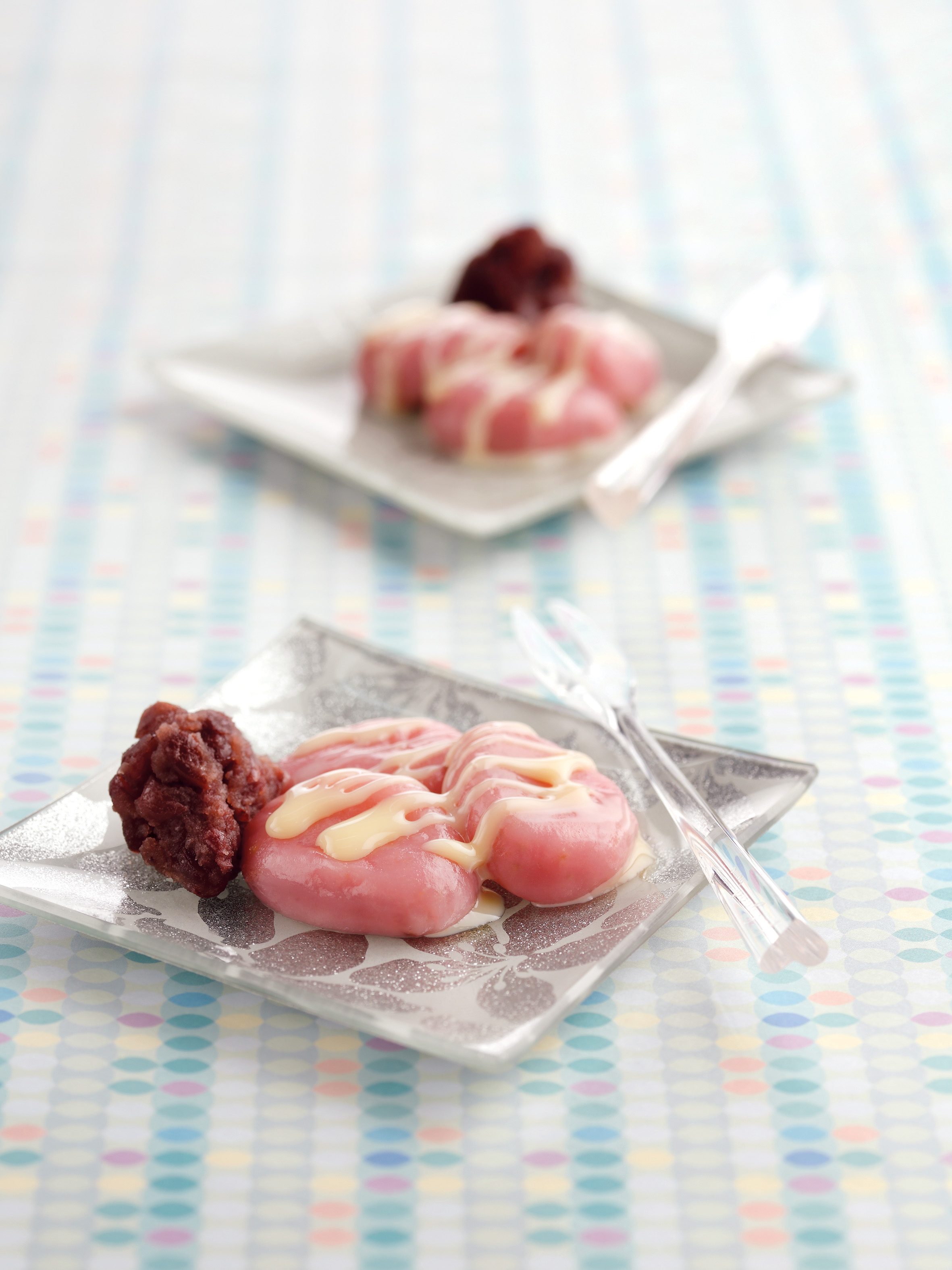 Mochi, whether traditional or frozen, is one of the most popular Japanese snacks. This cake is made from sticky rice and typically filled with anko, a red bean paste. In this version created by pastry chef Masataka Yamashita, strawberry paste is used instead. Another difference is the fact that the mochi are covered with condensed milk.