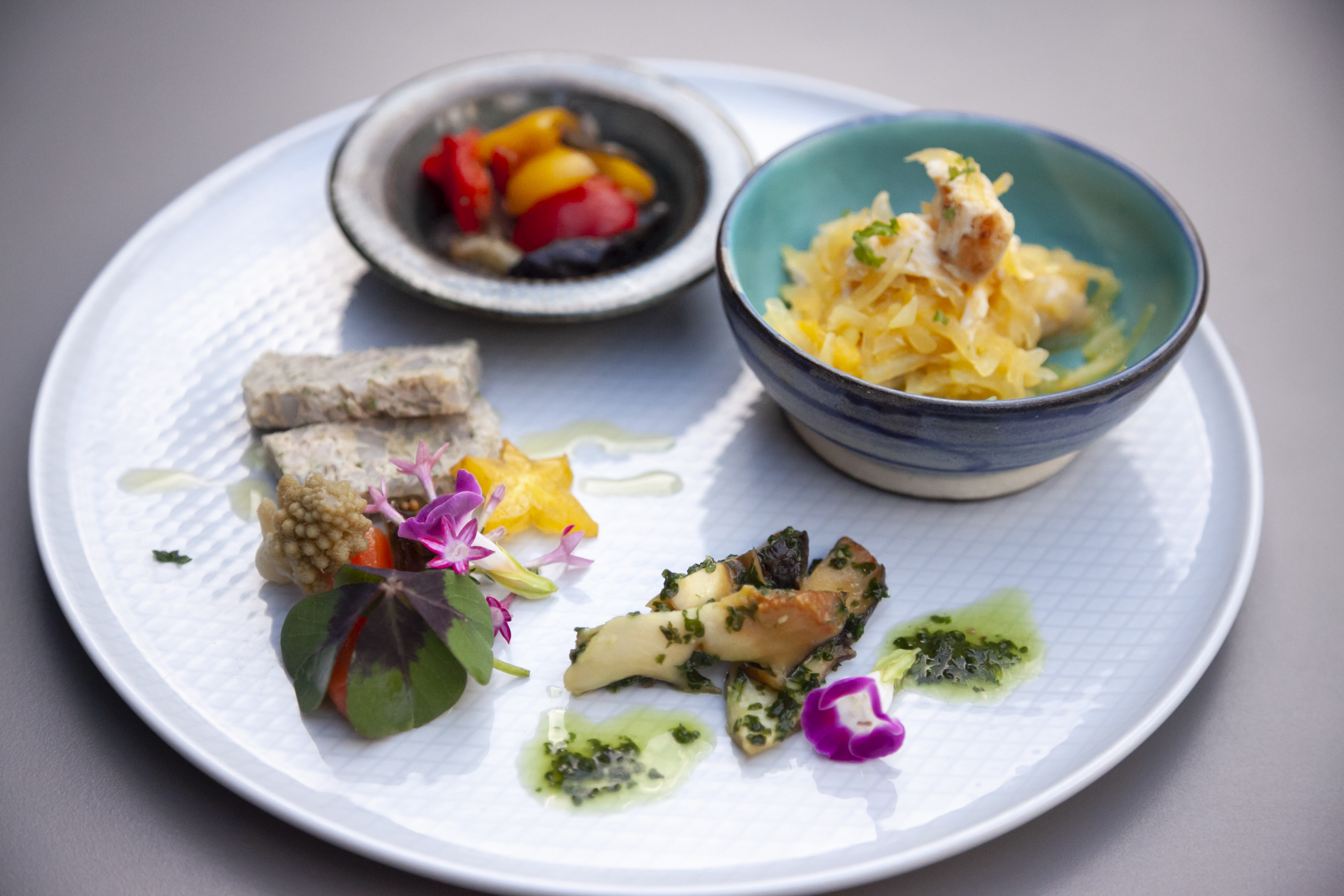 The food features assorted hors d'oeuvres using Okinawan ingredients, such as Yanbaru Shimabuta cartilage soki putty and island turban shell grilled with herb butter.