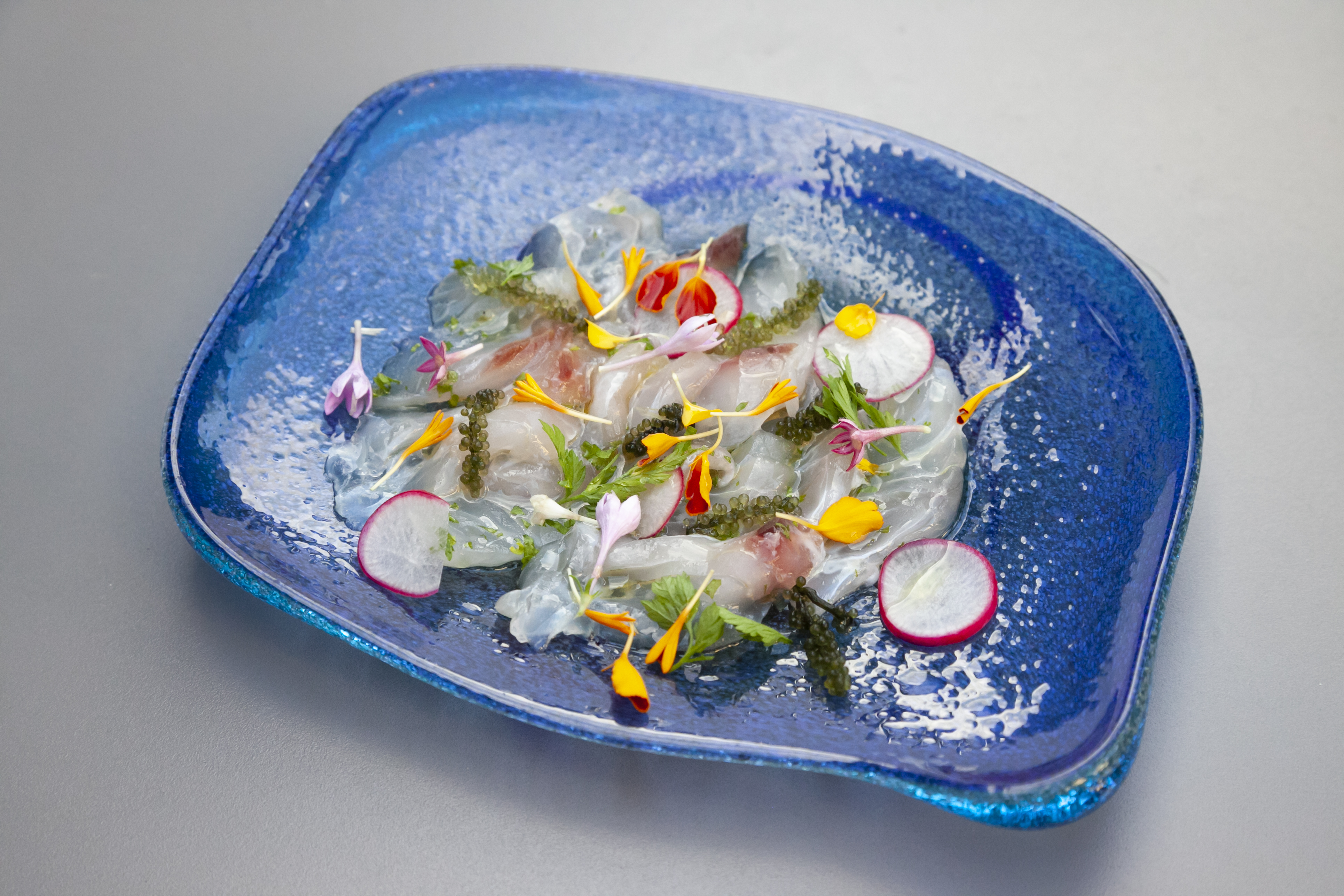 Carpaccio of Marmachi (Ohimedai), an appetizer using locally caught fish.