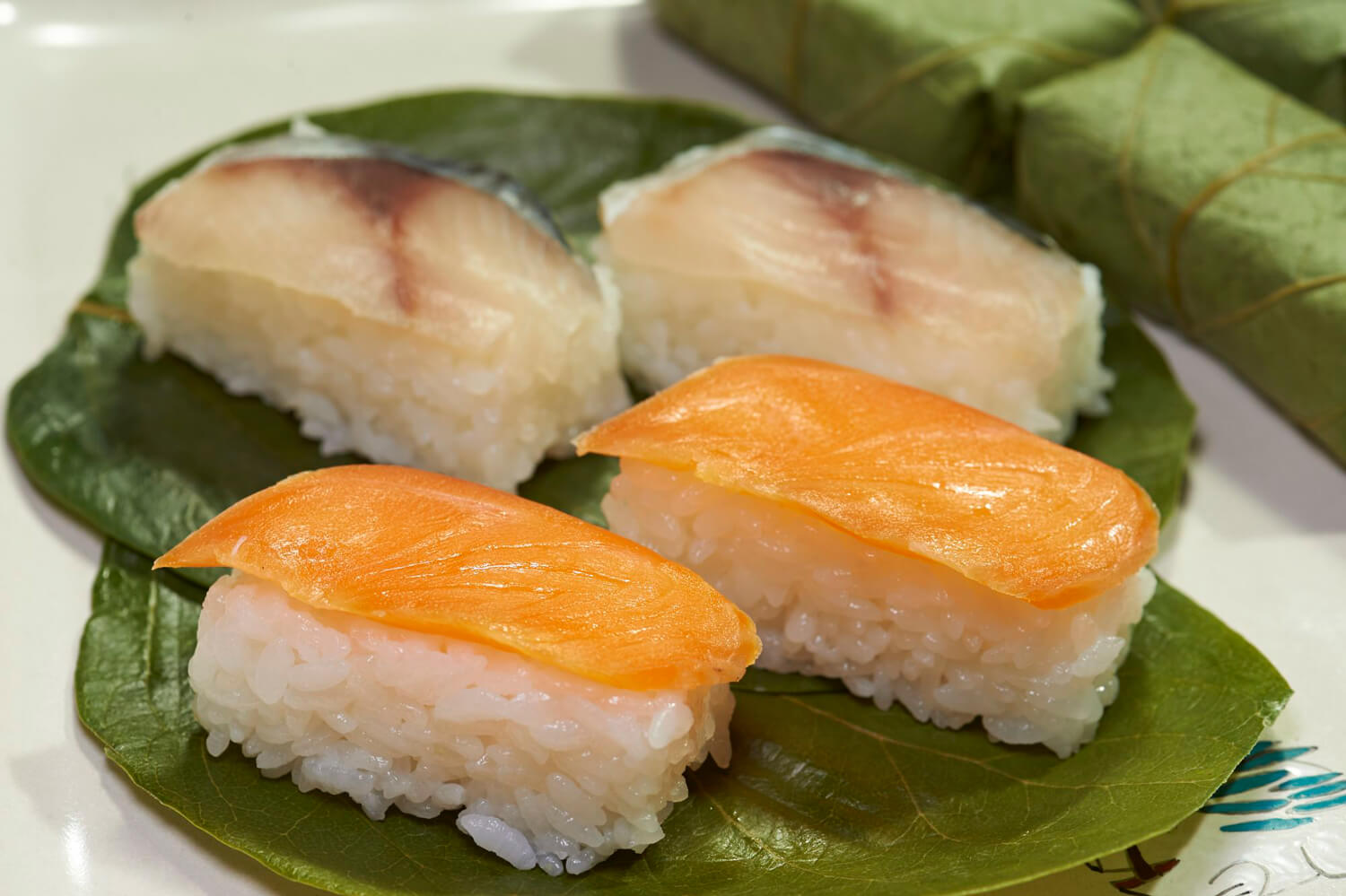 Kakinoha-sushi is a type of sushi that, in terms of shape at least, is no different from the rest: it consists of a slice of raw fish on top of some rice. The difference, however, becomes clear when it’s eaten: it has a lightly sugary taste, a result of the contact with the leaf it’s wrapped inside.
