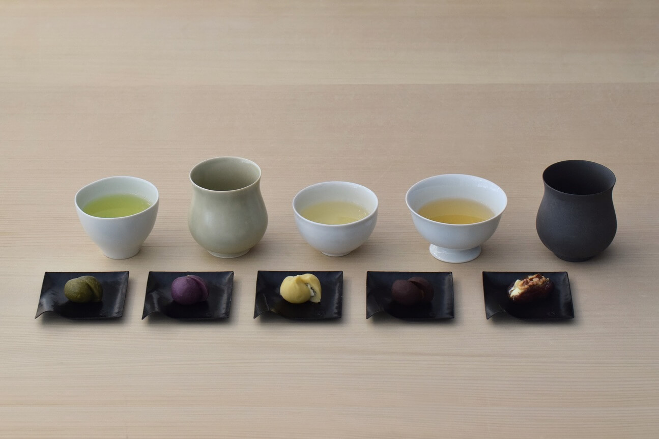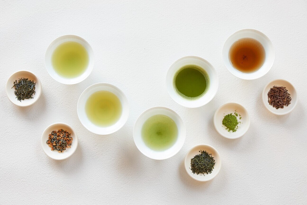 From left: ‘Sencha’, ‘Genmaicha’, ‘Gyokuro’, ‘Matcha’ and ‘Hojicha’.