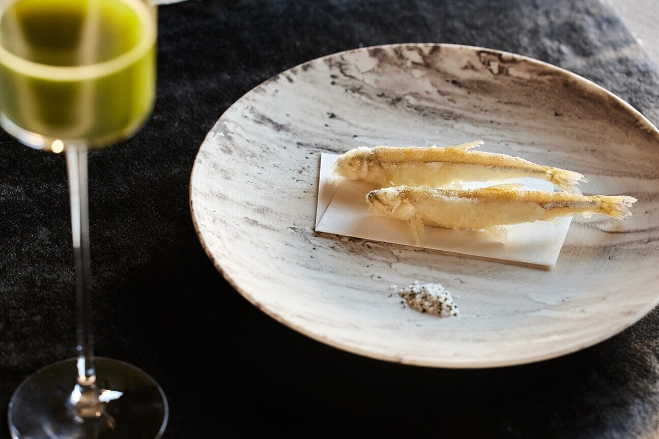 Tempura of Japanese smelt with ‘konbu’ salt paired with Saemidori Matcha soda with a squeeze of lemon. (Producer: Yamecha Kumaen)