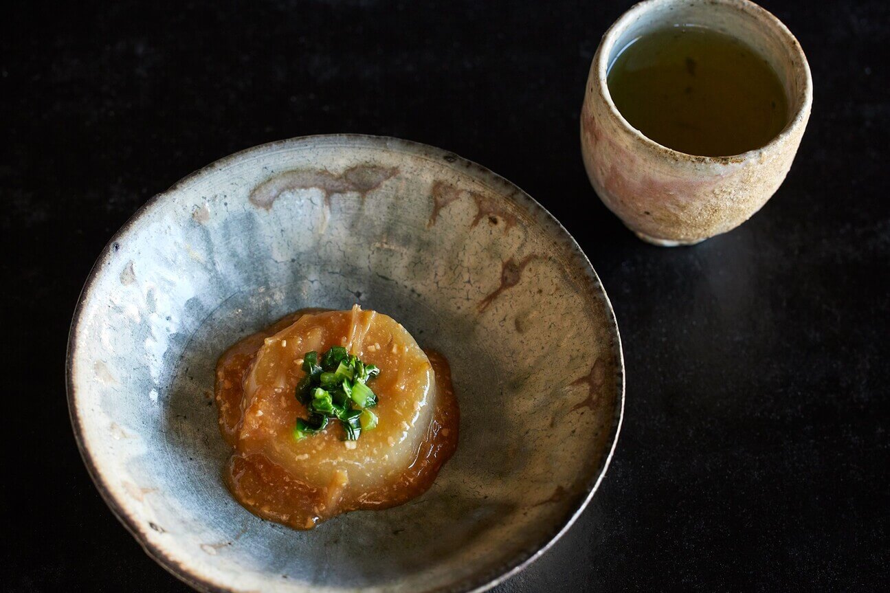 Boiled daikon topped with four kinds of white miso paired with hot Minoru Pan-fired ‘Genmaicha’ from Miyazaki in Kyushu. (Producer: Kadota Seicha)