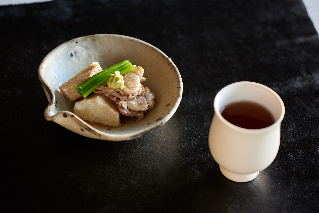 Nagamine has paired the next dish—boiled daikon radish topped with four kinds of white miso—with a pan-fired Genmaicha. ‘Typically, you drink Genmaicha by itself, but because you have roasted rice grains in there, it goes well with roasted flavours,’ Brekell says. ‘It’s very soft on the palate and has umami too, so it will go well with miso which also has umami, a slightly roasted flavour.’
