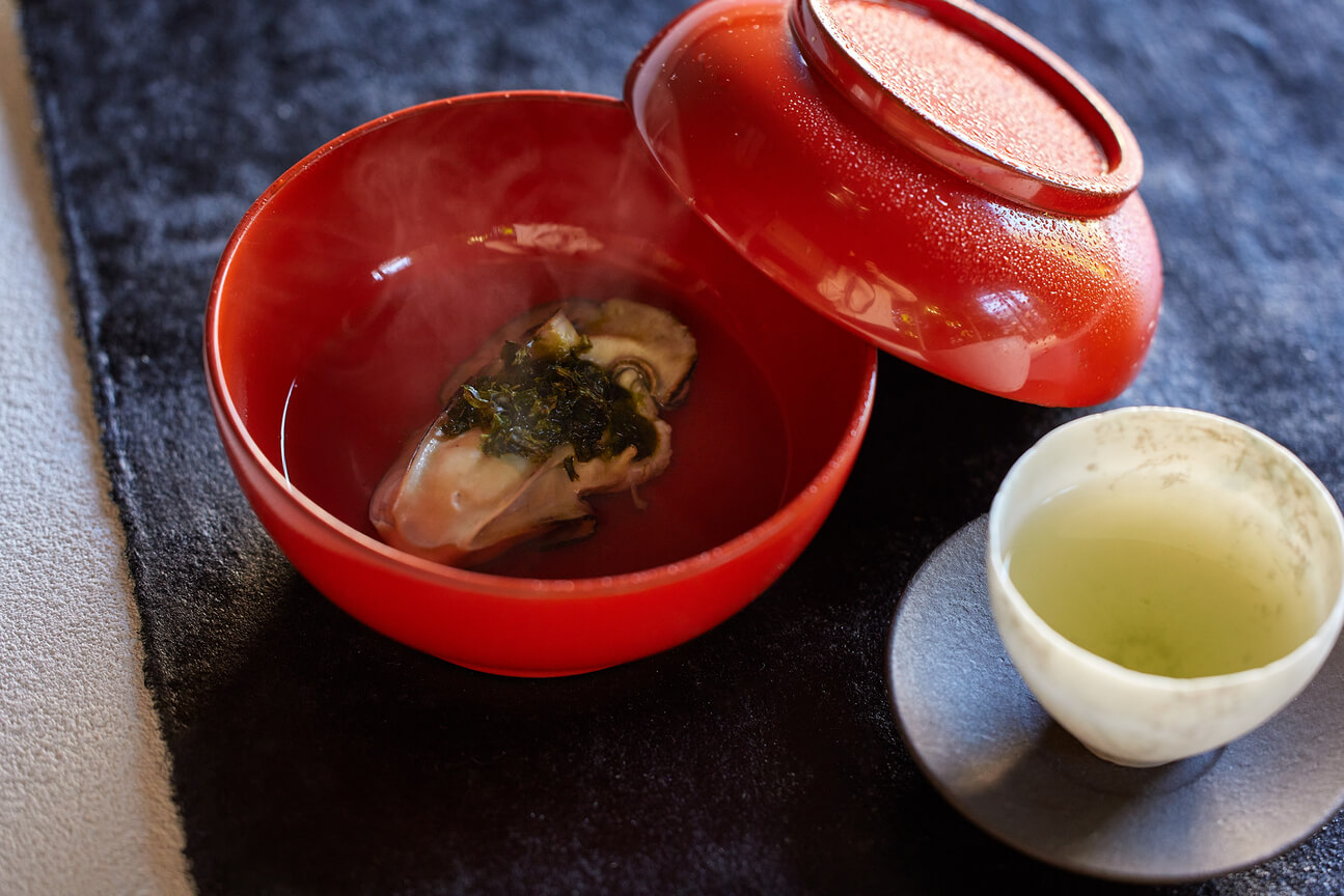 Sake-steamed oyster garnished with seaweed paired with a hot second-infusion of Meijin ‘Gyokuro’ from Kyoto. The rich ‘umami’ of the ‘Gyokuro’ amplifies the taste of the oyster. (Producer: Ujichasi Kanemata)