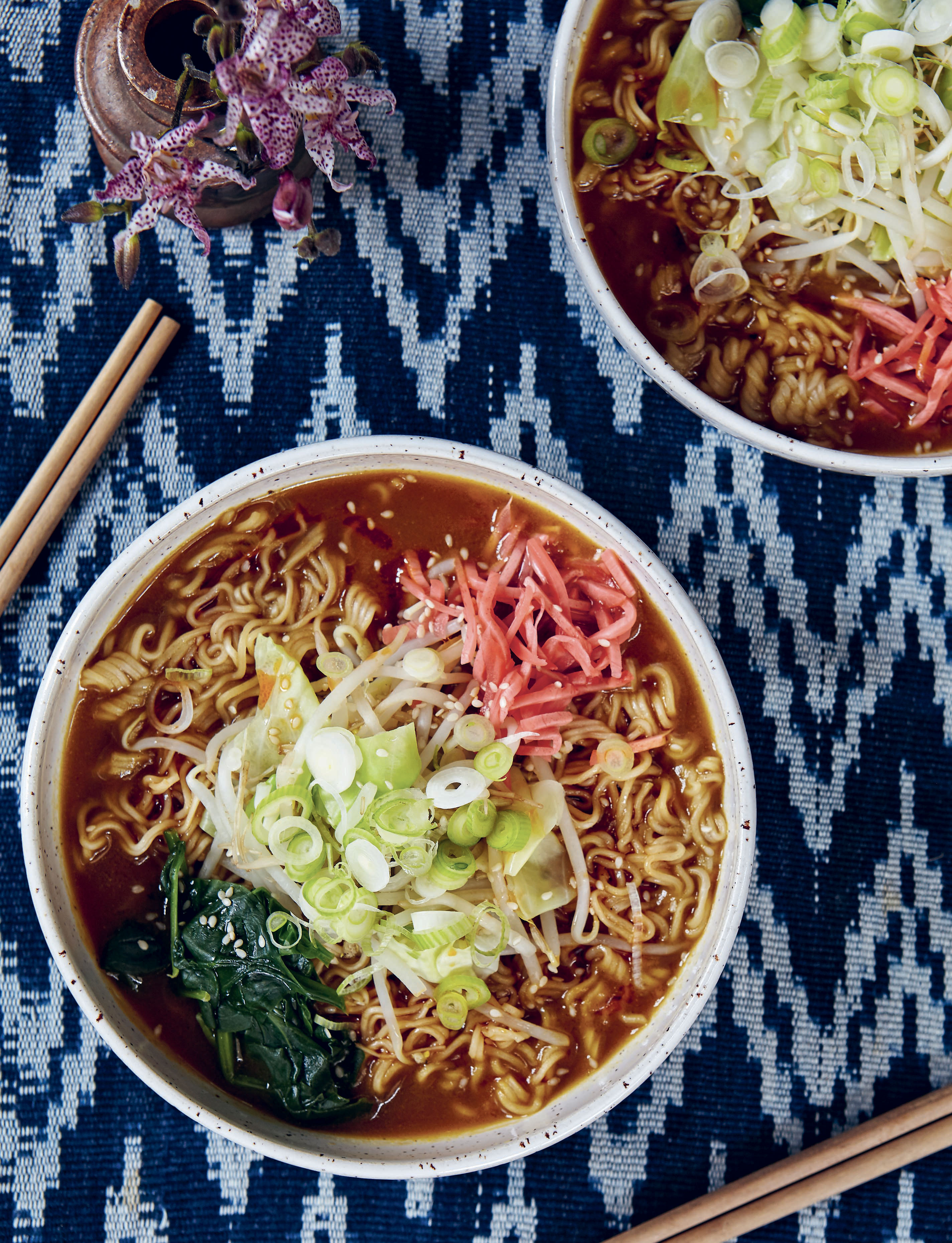 Divide the ramen among four deep bowls and ladle over the soup and spinach. Use chopsticks to gently stir the noodles through the soup, then top with the cabbage and bean sprouts, spring onions, sesame seeds, pickled ginger, and chilli or sesame oil.