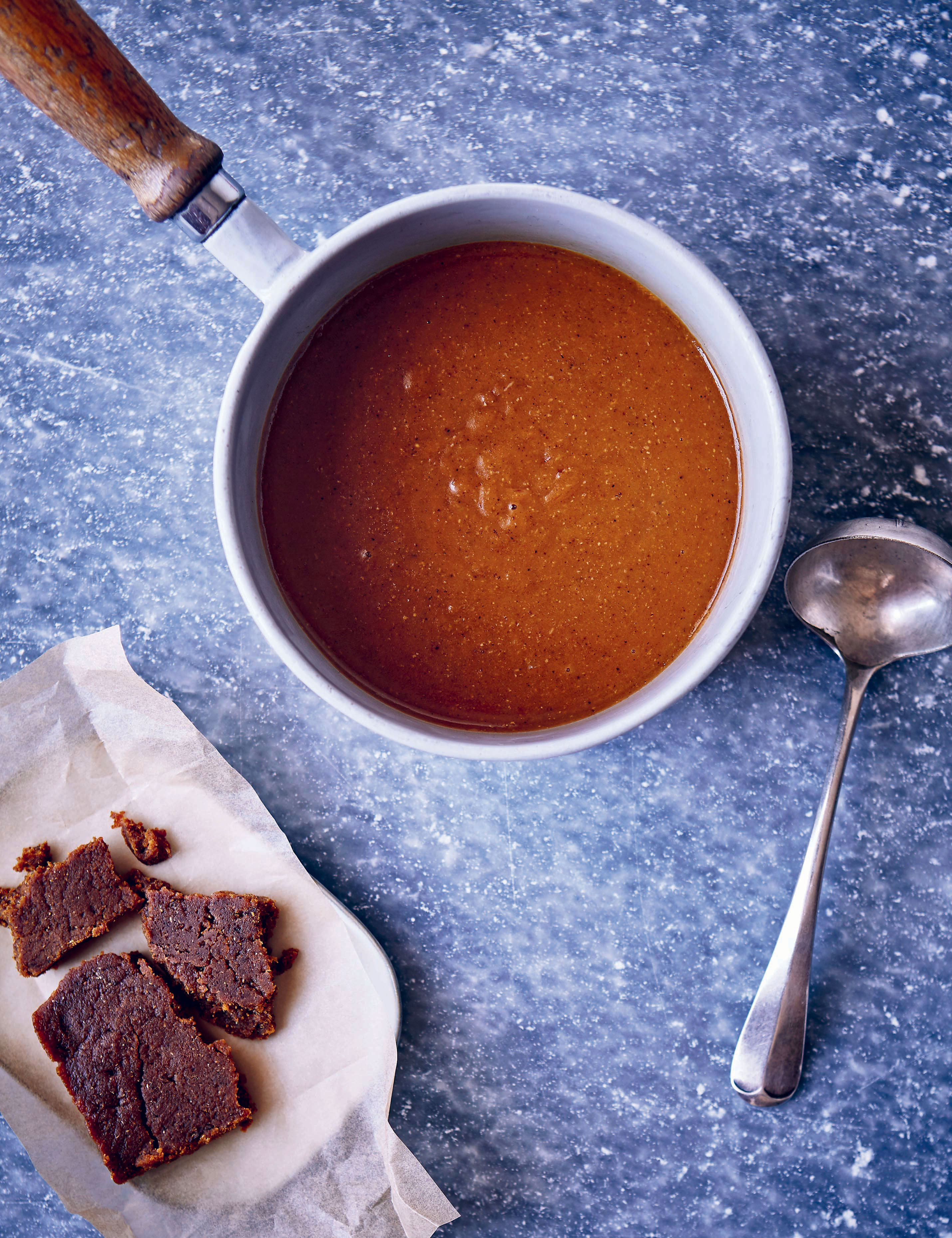 Add the tomato puree, peanut butter, spices, and yeast (if using) and continue to cook for a further 5 minutes, stirring constantly, until the spices have softened and the fat has absorbed the flour.