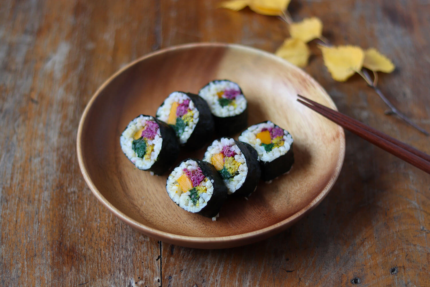This recipe for ‘aki no futomaki’ was created according to the precepts of ‘yakuzen’ which state that every meal must comprise five colours.