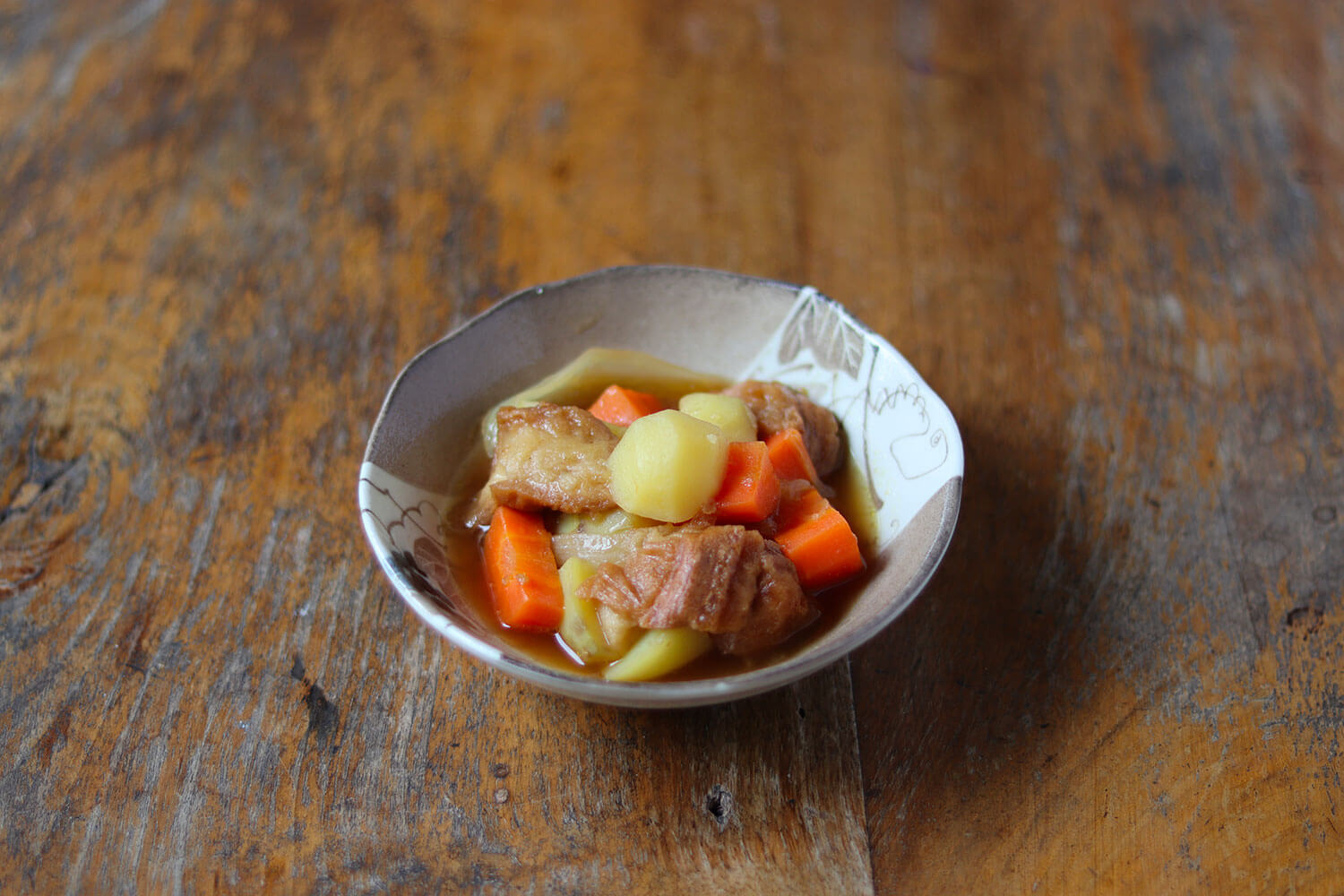 This is the case for this fu and potato stew, known as nikujyaga in Japon. Niku means ‘meat’ while jyaga is an abbreviation of the word jyaga-imo which means ‘potato’. Thus, the reader soon understands that this is not a dish that could appear in its usual form in a vegetarian cookbook. The mother and daughter therefore reinvented this winter dish they love in a meat-free version in which fu, wheat gluten that is mainly used in Buddhist cuisine, replaces beef, without losing any of its comforting side.