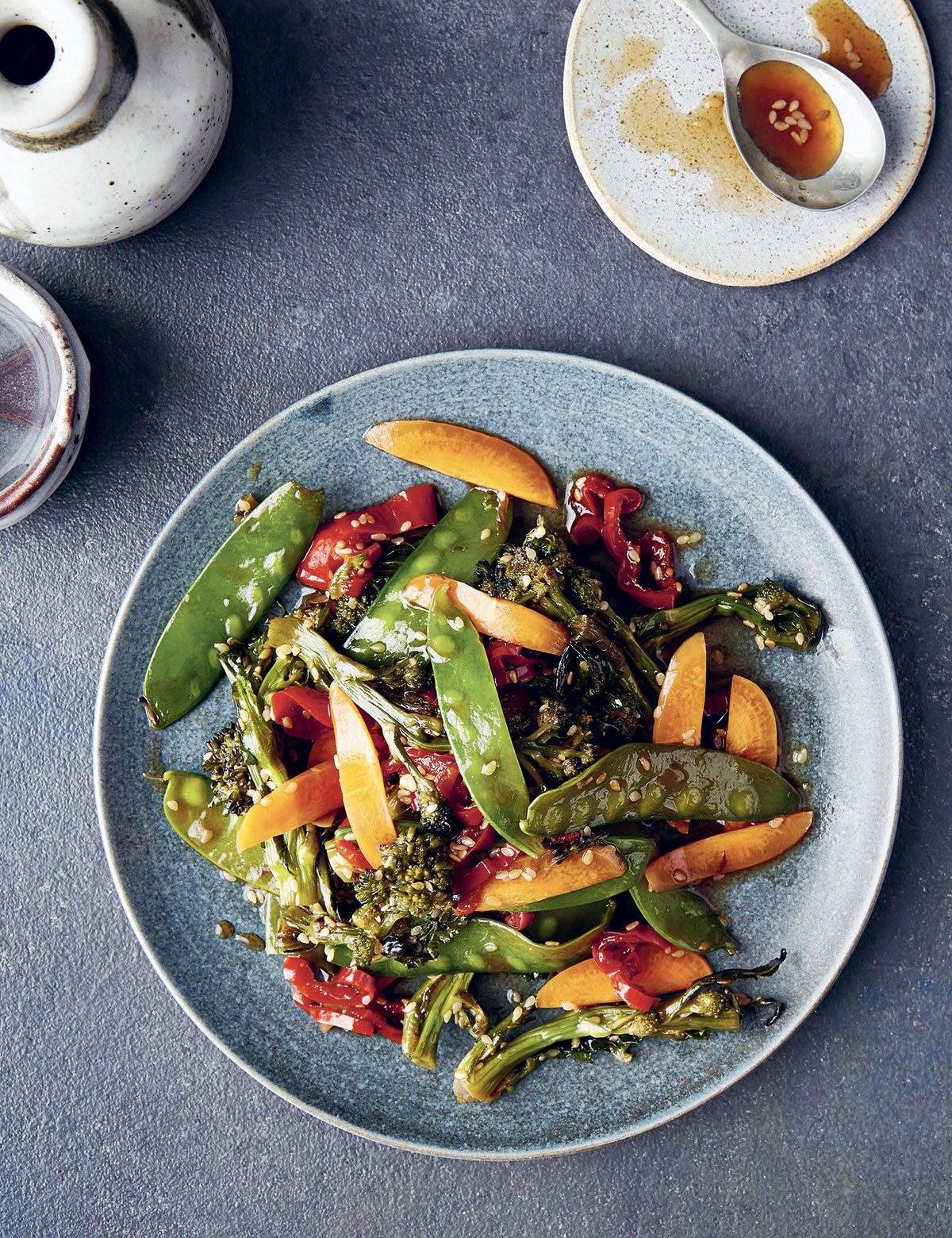 For this recipe for crunchy vegetables, he drew inspiration from the kinpira style that involves stir-frying the vegetables in a mixture of soy sauce, mirin, sesame oil, and chilli until the liquid reduces to form a thick, sticky glaze.