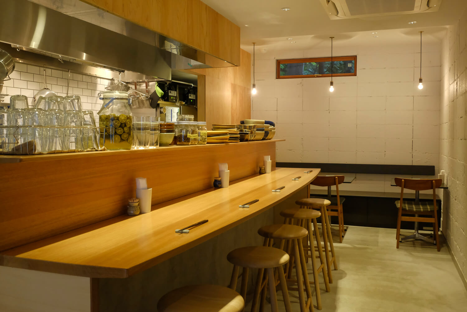 Here, on weekday evenings, sake and a tsumami menu (finger food and appetizers) are offered, arranged with unique selections such as yurinyu, prepared from minced tuna à la youlinji, the Chinese sweet and sour chicken dish. The stylish décor of subdued lighting and white bricks, which might easily be mistaken for a café, derives from the store in Brooklyn. The atmosphere, redolent of a ramen restaurant in New York, is casual, and across-the-counter conversation flows easily between staff and diners. Highly recommended for those who, after finishing off a bowl of ramen, want to linger and talk, sip sake, and relax.