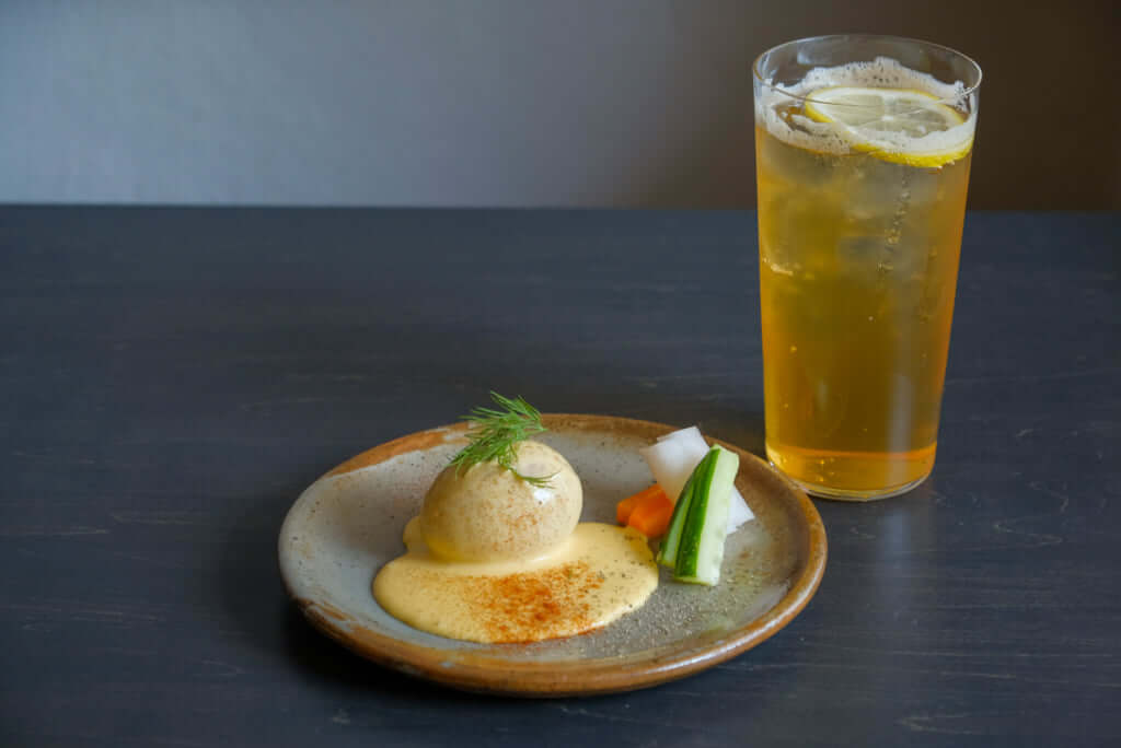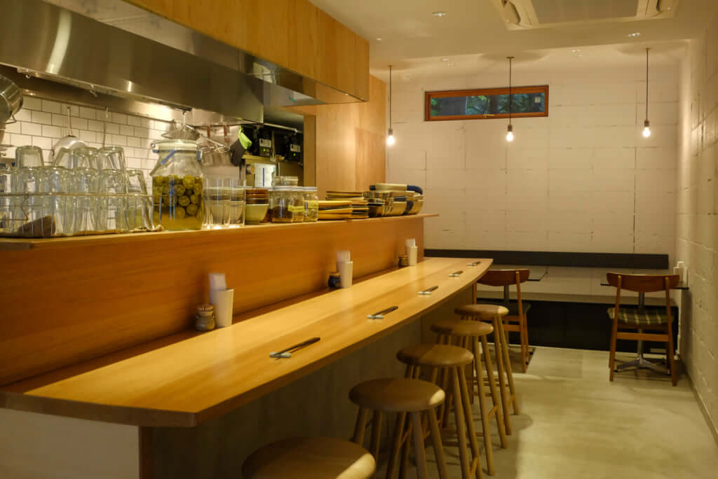 Here, on weekday evenings, sake and a tsumami menu (finger food and appetizers) are offered, arranged with unique selections such as yurinyu, prepared from minced tuna à la youlinji, the Chinese sweet and sour chicken dish. The stylish décor of subdued lighting and white bricks, which might easily be mistaken for a café, derives from the store in Brooklyn. The atmosphere, redolent of a ramen restaurant in New York, is casual, and across-the-counter conversation flows easily between staff and diners. Highly recommended for those who, after finishing off a bowl of ramen, want to linger and talk, sip sake, and relax.