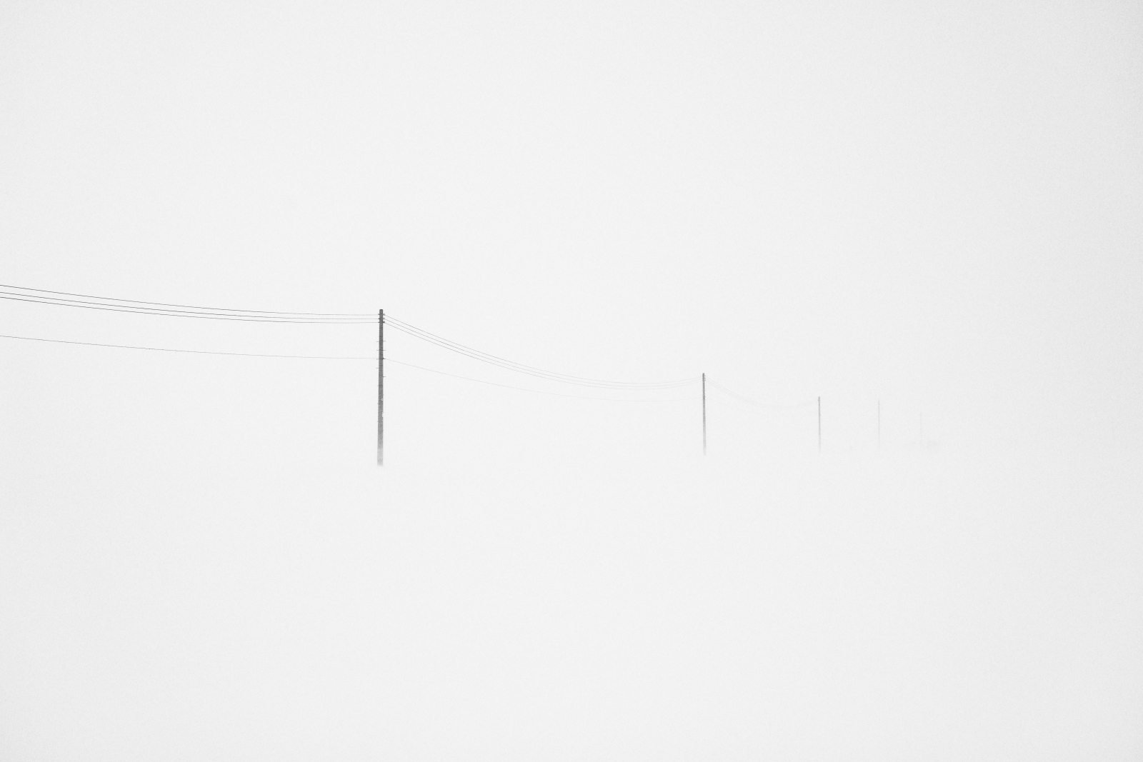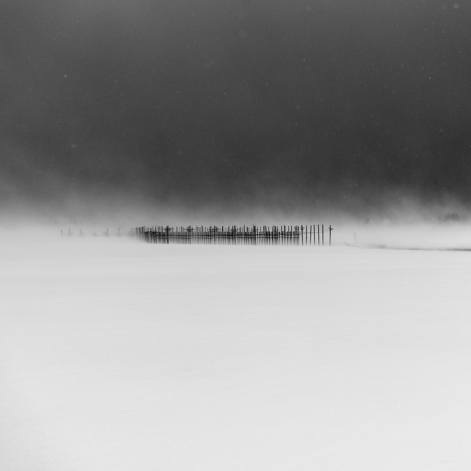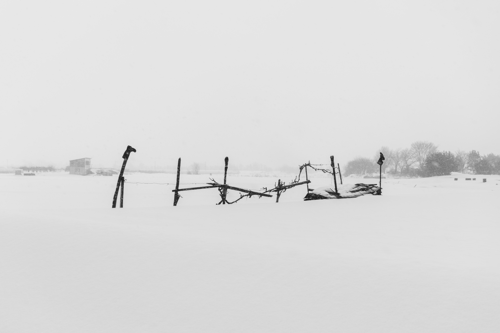 Le ciel et l’horizon balayés par la poudre blanche se retrouvent dans les photographies de Sho Shibata, où seuls un poteau électrique ou une barrière émergent, des photographies de paysage tutoyant l’abstraction, laissant le regard percevoir le quotidien des habitants de la région. Pourtant, les choses évoluent, et le mode de vie également. « Par mauvais temps, il y avait des jours où je ne pouvais pas sortir pour réaliser des photographies, il neigeait trop, mais ces dernières années, il y a eu peu de neige et le printemps est arrivé tôt. J’ai réalisé que cela avait un grand impact sur l’écosystème », poursuit l’artiste.