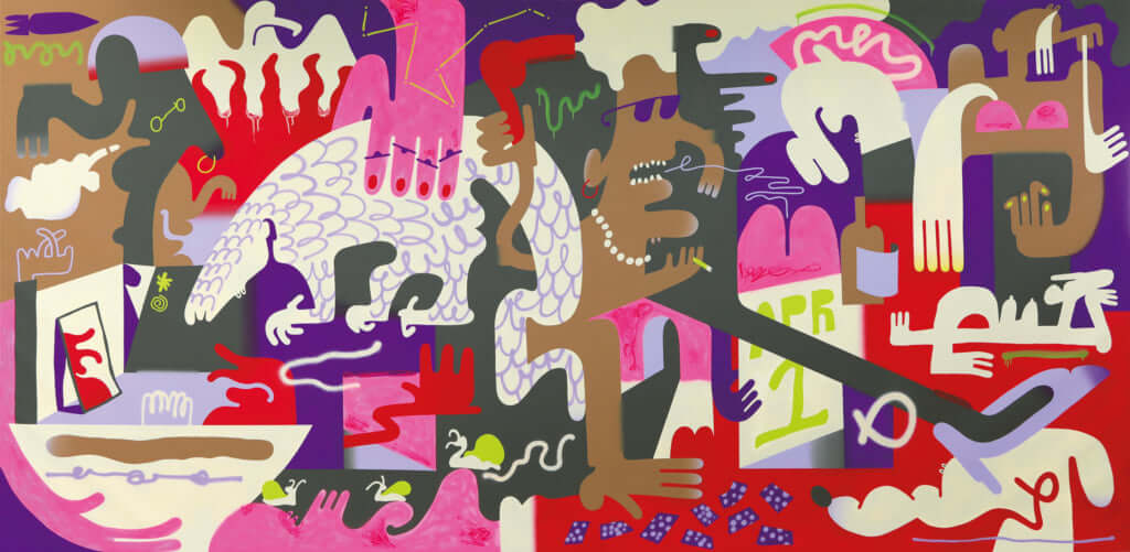 L’artiste compose des peintures vibrantes et rythmées, où abstraction et figuration s’entrechoquent dans une harmonie ludique.