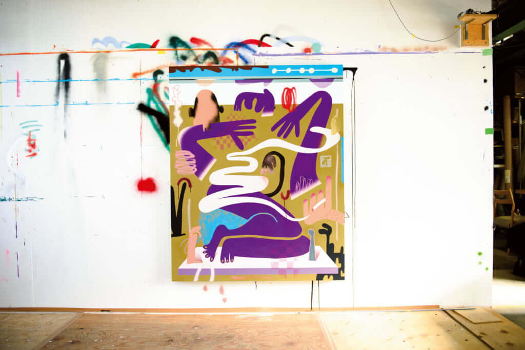 « Je voulais m’impliquer dans la création, alors j’ai cherché un poste d’assistante auprès d’un artiste. Mais je me suis rendu compte que c’était difficile de développer mon propre travail tout en travaillant pour quelqu’un d’autre. Après trois ans passés aux côtés de Keiichi Tanaami, l’envie de peindre est devenue trop forte. J’ai fini par quitter ce poste pour me consacrer pleinement à mon travail. »