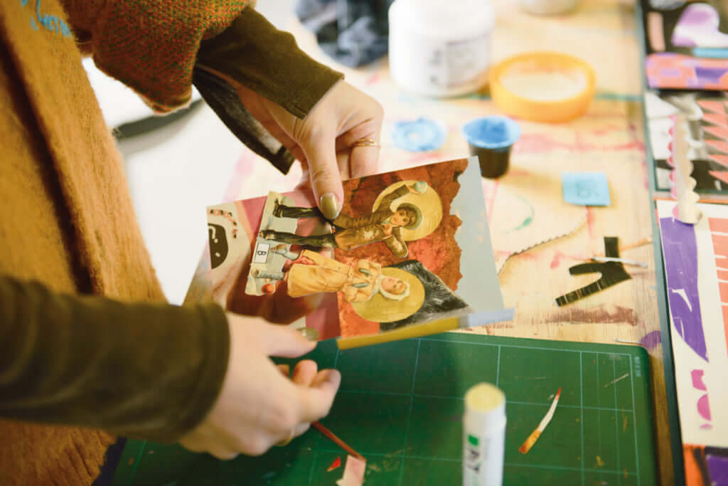 “Untitled”, 2024. Techniques mixtes, collage sur panneau, 60 × 90 cm. Même lorsque ses collages intègrent des motifs reconnaissables, l’usage instinctif de la couleur et la composition propre à Keeenue restent immédiatement identifiables.