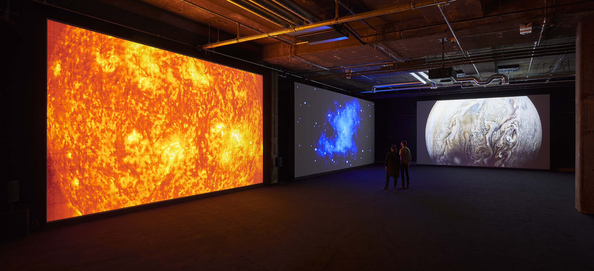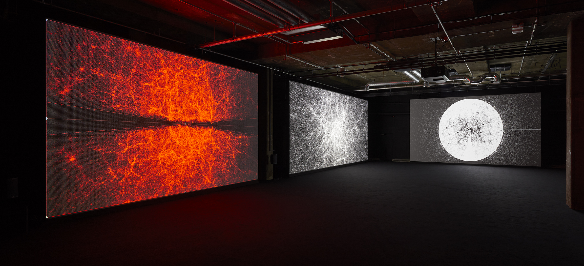 Au 180 The Strand à Londres, les installations audiovisuelles de Ryoji Ikeda entraînent le public vers de nouveaux extrêmes cosmiques, au milieu d’éclairs lumineux et de systèmes planétaires dérivant lentement. Ici, chaque son provoque un mouvement de tous les éléments, de la cellule biologique au circuit imprimé, jusqu’au trou noir. Alors que les nombres s’agitent à côté du bruit blanc, l’univers numérique de Ryoji Ikeda questionne les limites de la recherche technologique et des capacités de la connaissance humaine.