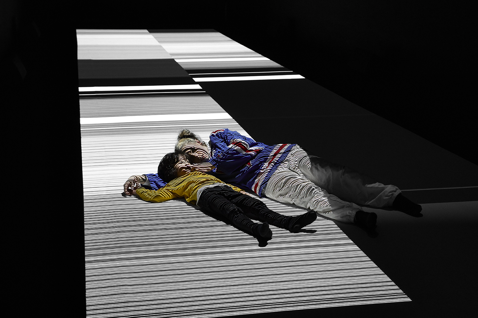 Le langage audiovisuel de Ryoji Ikeda s’articule autour de programmes et d’algorithmes, permettant la génération de codes-barres et systèmes binaires. Comme c’était le cas dans une oeuvre précédente test pattern — dont une version adaptée au lieu est présentée —, des programmes auto-écrits calculent un ensemble de données, comme le mouvement des visiteurs, retranscrit en son et lumière. Mais dans ces nouvelles œuvres, parmi lesquelles la trilogie Data-verse, l’artiste intègre davantage de données scientifiques, dont des datas mathématiques sous-jacentes à la cosmologie, à la physique quantique ou à la structure de l’ADN. Ces superbes images sont accompagnées d’une bande-son électronique, pour une rencontre étonnamment kaléidoscopique, amenant le public vers une tension sensuelle.