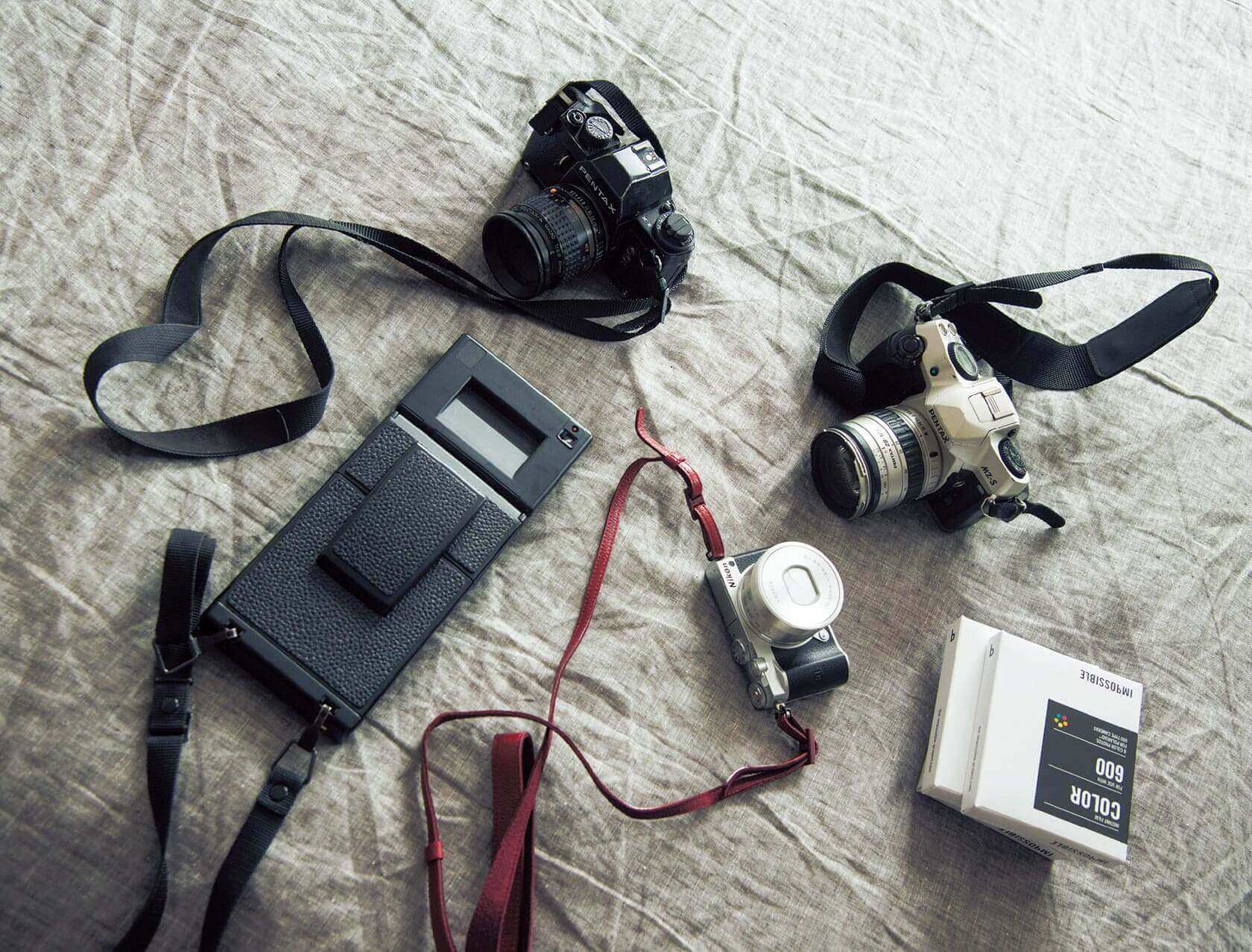 Dans le sens des aiguilles d’une montre depuis le haut : Pentax LX (reflex mono-objectif 35 mm manuel), Pentax MZ-S (reflex mono-objectif 35 mm autofocus), film instantané couleur Fo 600 de marque « Impossible », Nikon 1 J5 (reflex mono-objectif numérique sans miroir), Polaroïd SLR 680 (appareil photo instantané reflex mono-objectif). Tous les appareils, hormis le Nikon numérique, sont des modèles qui ne sont plus vendus. Araki possède aussi divers autres boîtiers, notamment de marque Leica, Contax et Mamiya. Pour les pellicules, il recourt selon le cas à des films couleur, noir et blanc, à basse sensibilité, etc.