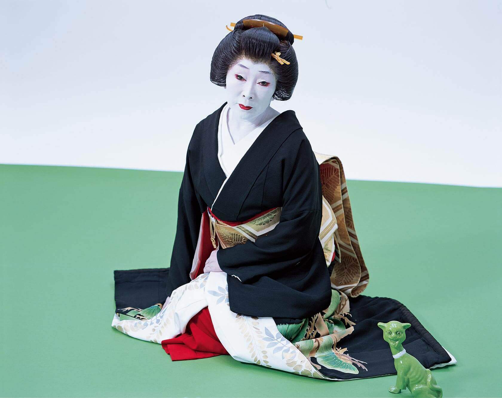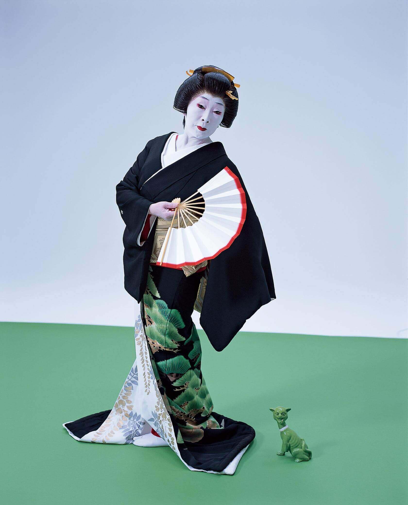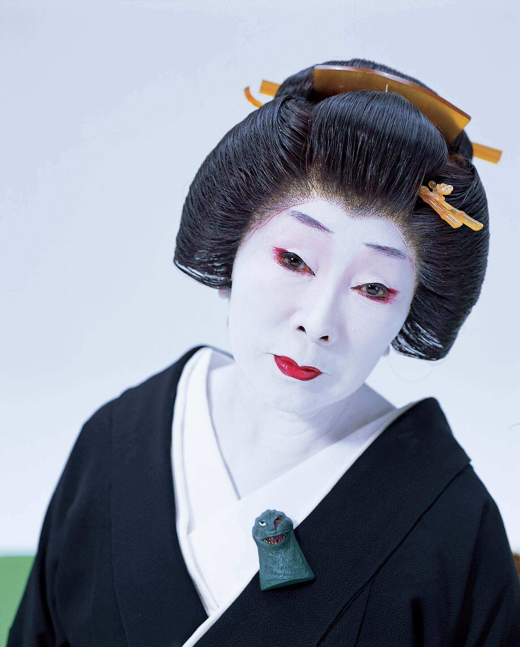 Ikuko Neesan a consacré plus de cinquante années de sa vie au métier de Geisha à Akasaka. Dans ce quartier, tout le monde connaît cette personnalité qui est née la même année qu’Araki. Elle jouit aussi de la confiance du monde des politiques et de la finance et elle continue encore aujourd’hui son activité de geisha. Ikuko san dansante, souriante, avec cette allure élégante laisse Araki en émoi, posté, son appareil prêt à se déclencher. Comme dans un dialogue, ils réduisent peu à peu la distance qui les sépare. Un dragon ou un godzilla apparaît, personnifiant le photographe. « En fait, je veux me mettre en scène ! » plaisante-t-il. Le photographe cohabite avec son sujet et partage avec lui cet «instant». C’est ainsi que se sont accumulés d’innombrables liens avec ces différents modèles croisés pour ces occasions. « Rappelle-toi un homme que tu as aimé autrefois ! Tourne-toi un peu vers la gauche.» À l’instant où naît cette relation particulière entre le photographe et son modèle, résonne alors dans le studio le bruit de l’obturateur du Pentax 67 II.