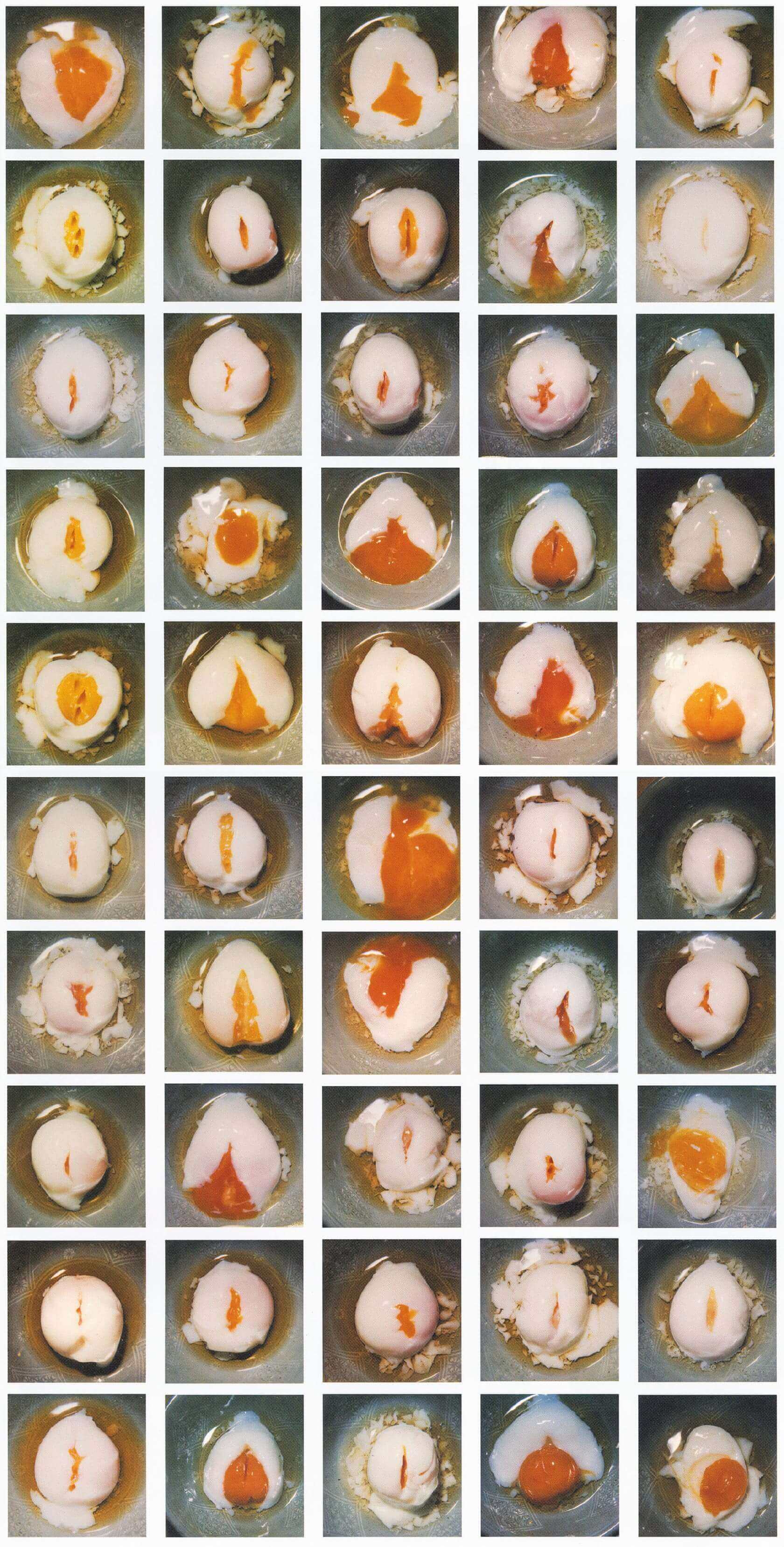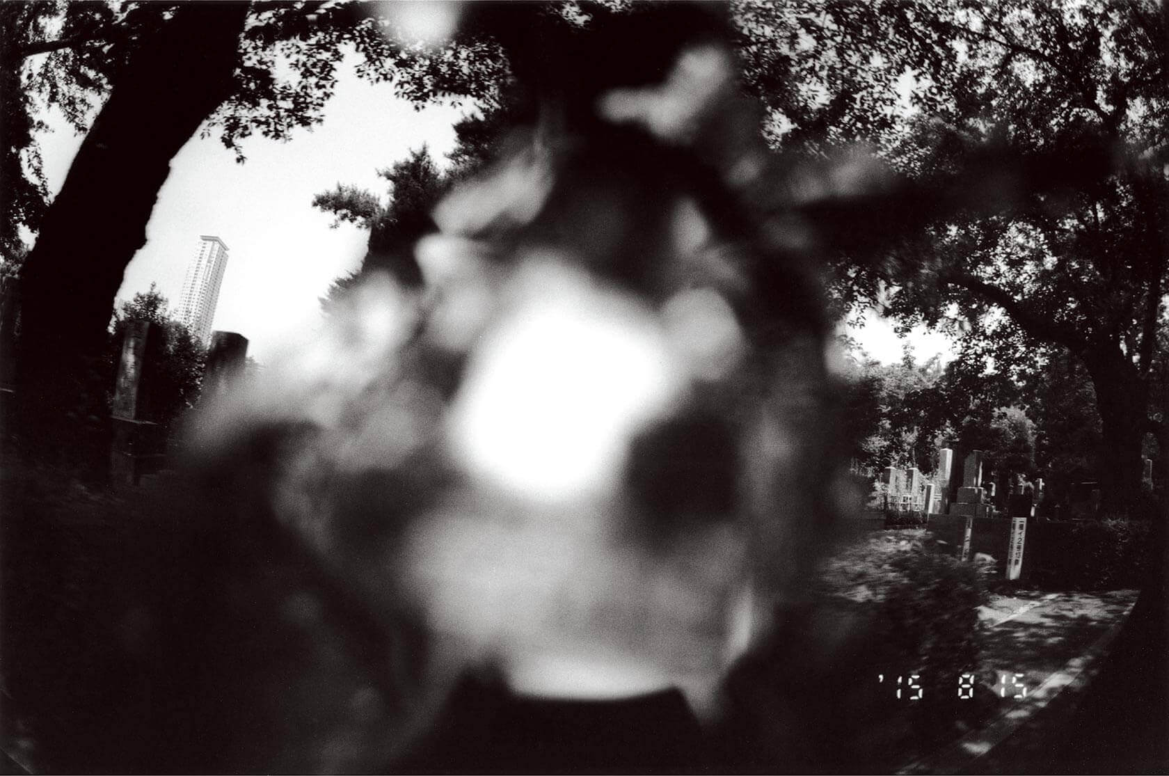 Les œuvres de Niki de Saint Phalle, cette artiste qui a produit les « tirs », ces tableaux faits de récipients contenant des couleurs sur lesquels elle tire au fusil (une rétrospective a eu lieu fin 2015 à Tokyo). Avec l’idée de lui rendre hommage, Araki, grand fan des œuvres de Niki, a brisé l’objectif de son appareil en lui portant des coups. Les photos ainsi obtenues reflètent le monde qu’il voit de son œil droit, son œil qui a perdu ses capacités de vision. « C’est bien comme ça que je vois. C’est étrange, non ? » La photo est datée du « 15.8.15 » : c’est le 70e anniversaire de la fin de la Deuxième Guerre mondiale. Araki pour qui les buildings de Tokyo sont comme une « nécropole » laisse entrevoir par cette photo deux cimetières saisit avec son œil droit. Le photographe voudrait-il tirer à lui le hasard pour se dévoiler grandeur nature, avec son champ de vision limité ? Ces Cimetières de l’œil droit se situent à la croisée du hasard et de la nécessité.