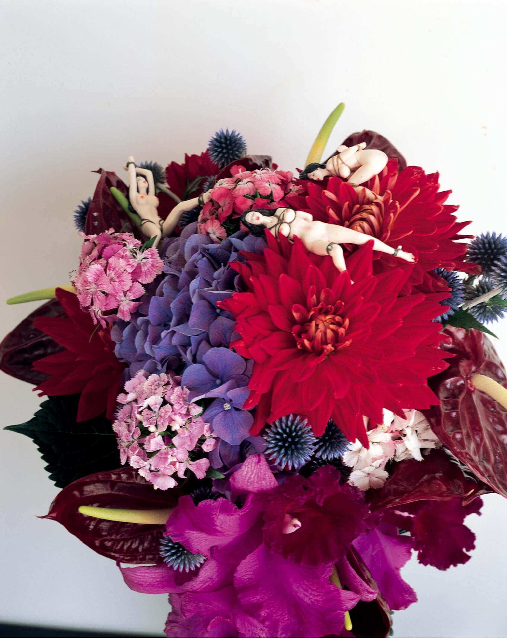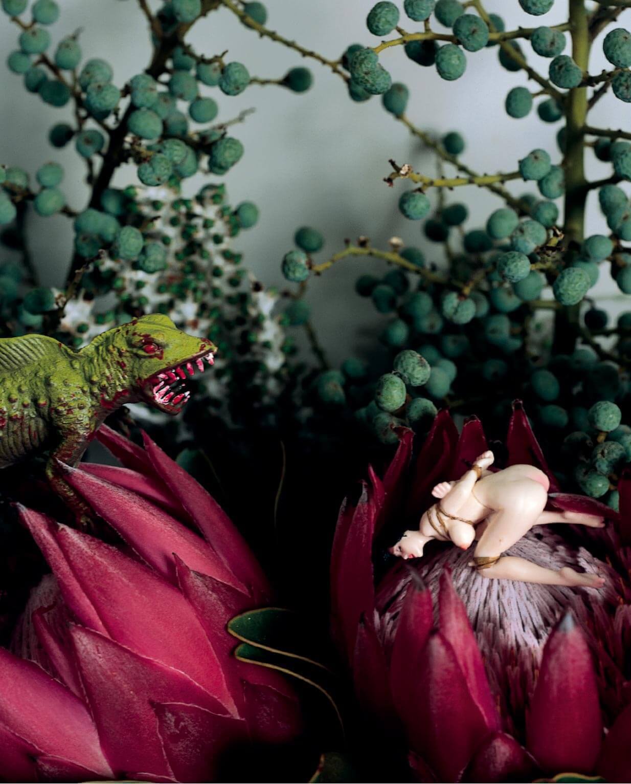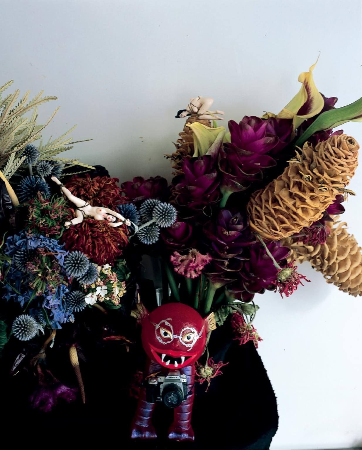 « Les “paradis”, je les photographie les samedis et les dimanches. » Araki s’enferme chez lui lors de la séance photos de la série Paradis. De mémoire récente, on a les Paradis en noir et blanc, publiés cette année, mais pour notre revue la série a connu une nouvelle évolution avec les Étranges paradis. Des monstres, des figurines sado-maso, un lion vert, la figurine du démon de la photo Araki… Ce masque regardant au loin coexiste avec les fleurs et les plantes de couleurs vives. Ces fleurs dans la force de leur épanouissement tendent vers une limite, elles vont se faner. La poupée, figurine inorganique, exsude un sentiment de néant. C’est une “odeur de mort” inquiétante qui flotte dans ces étranges paradis. Ces paradis d’Araki dans lesquels « la déesse de la vie est présente, tant que c’est en couleurs » oscillent dangereusement sur une frontière étroite entre la vie et de la mort.