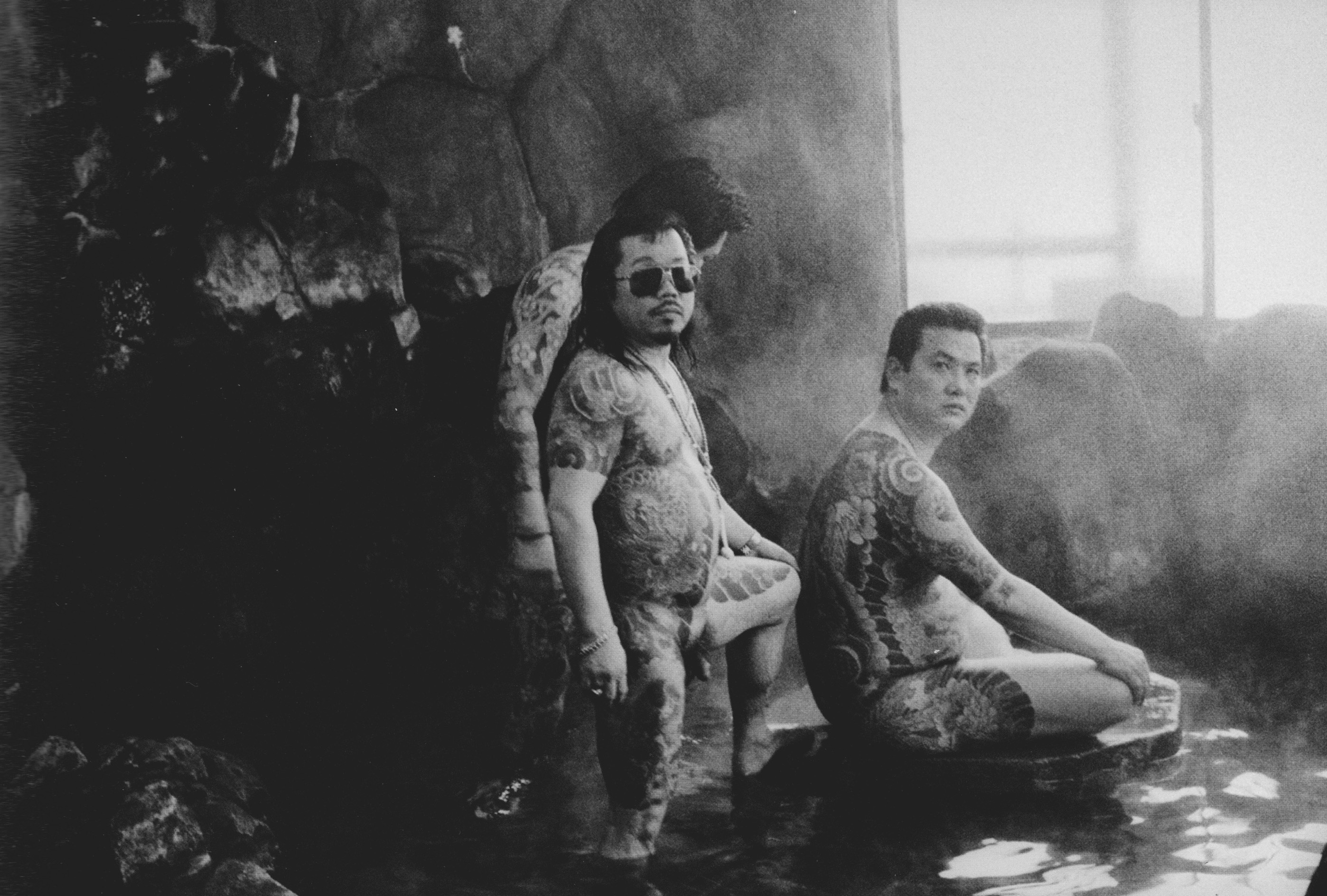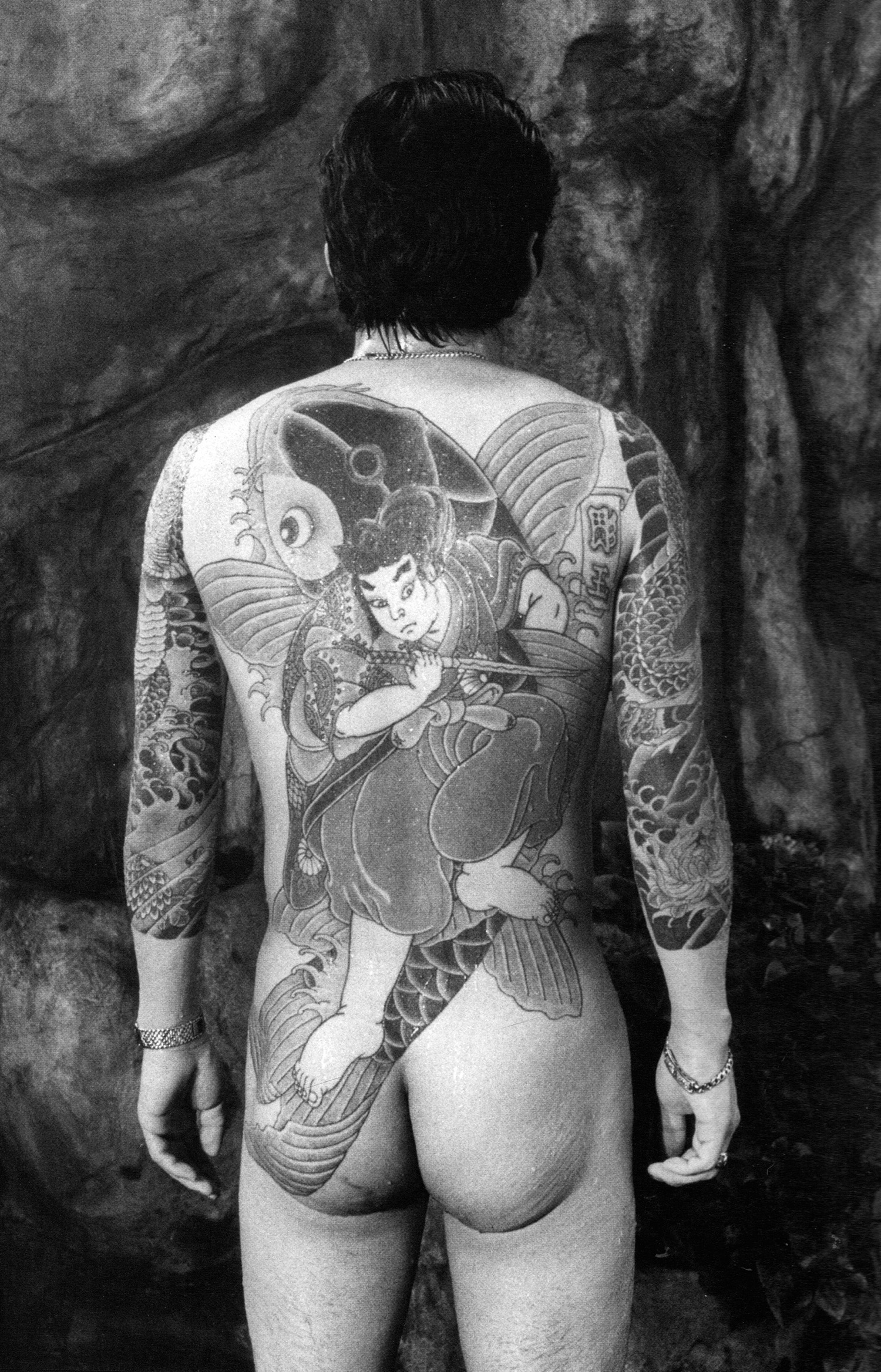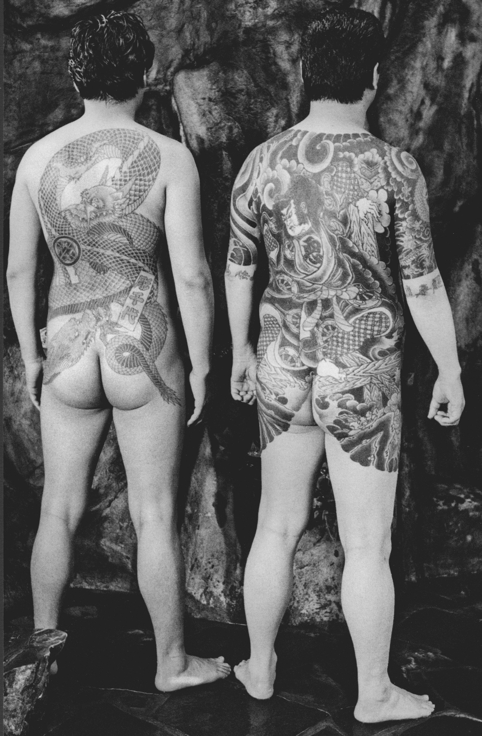 Dans le sens de lecture occidental, le lecteur découvre la série Tatouage Yakuza, réalisée par Irina Ionesco en 1996. Alors en voyage à Tokyo pour une série de conférences et la mise en place d’une exposition, elle est mise en relation, par l’intermédiaire de son éditeur japonais, avec un clan de mafieux. Elle part donc un dimanche pour la campagne japonaise, vers une localité tenue secrète où elle rencontre les yakuza qui ont privatisé un hôtel avec onsen pour la séance photo. Sur les clichés, uniquement en noir et blanc, condition sine qua non du chef yakuza Oyabun, se dessinent des corps nus, uniquement parés de tatouages et de bijoux clinquants. Les gros plans sur les pièces d’encres recouvrant le dos, le torse et une partie des jambes succèdent aux plans plus large où l’on découvre les membres du groupe, à visage découverts et parfaitement reconnaissables.