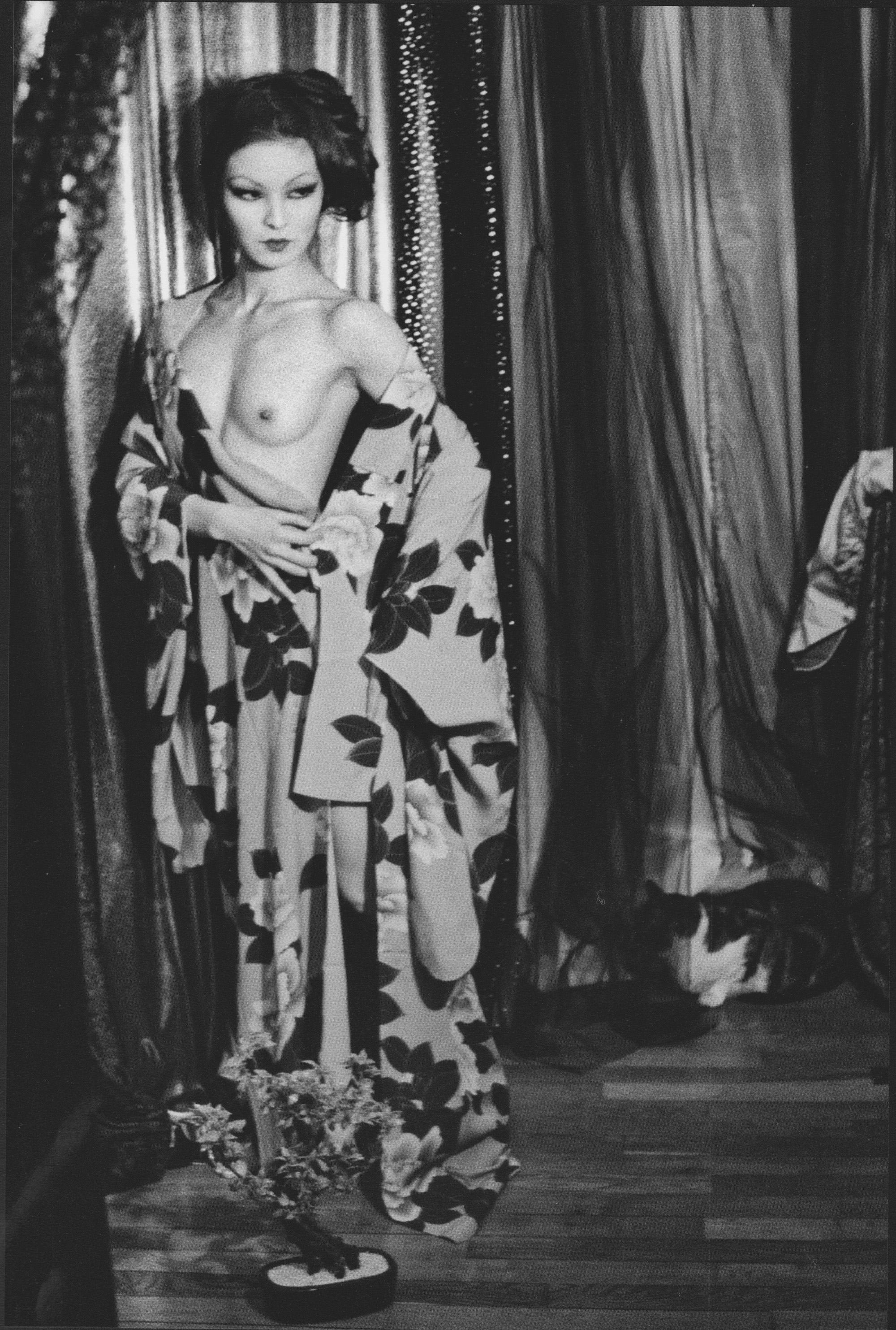 Dans le sens de lecture japonais, on découvre la série Romantica, une artiste underground qui se produisait alors dans les théâtres d’avant-garde du Japon. Lors d’un passage à Paris avec son impresario, elle entre en contact avec Irina Ionesco, qui la photographie dans la capitale française avant de poursuivre sa série au Japon. Là encore, le corps est nu, tantôt recouvert de tulle, tantôt à moitié subtilisé aux regards par un kimono.
