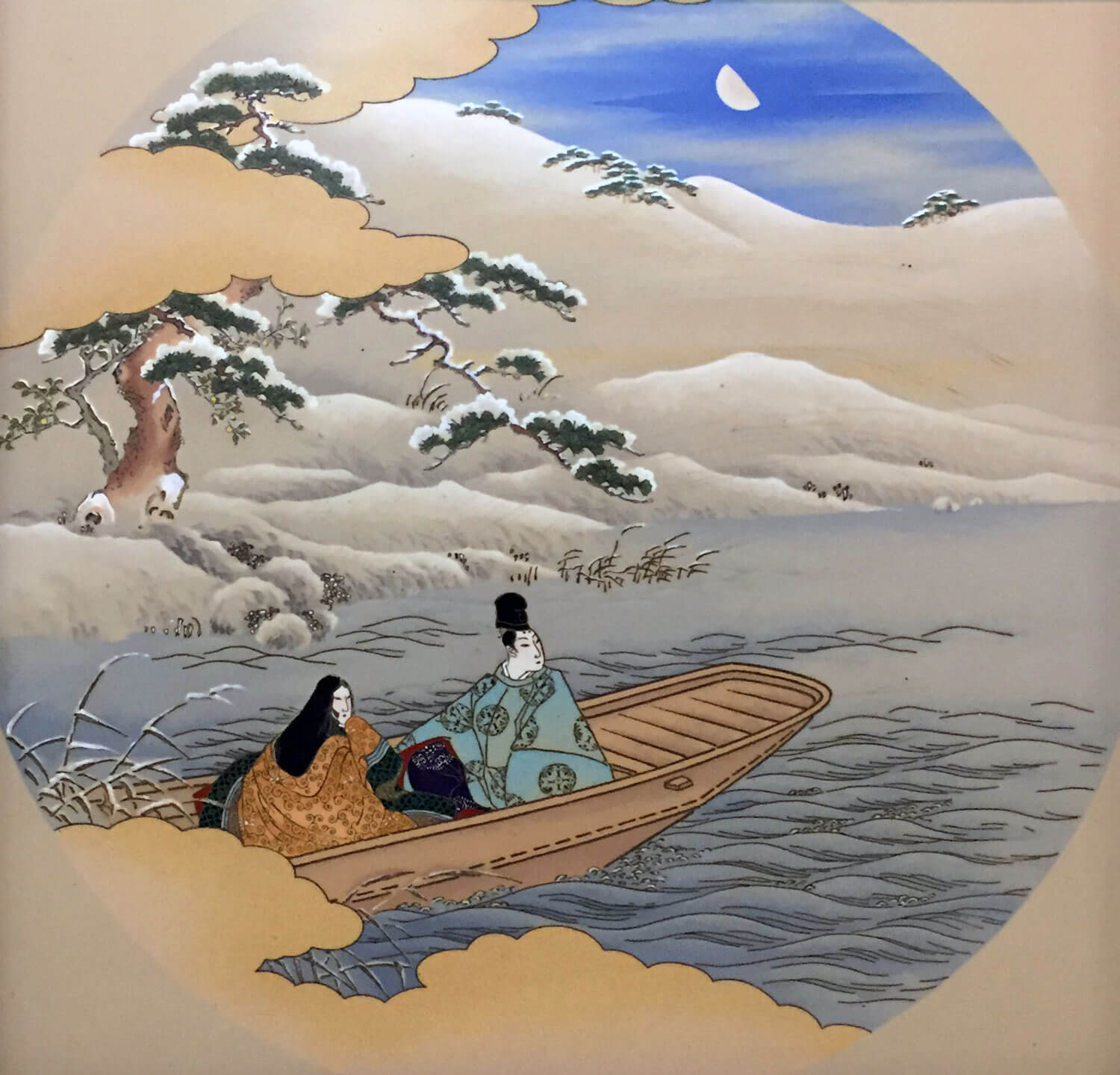 “Promenade à bord d’une barque”, illustration du chapitre “Ukifune” du “Dit du Genji”, émaux cloisonnés, Japon, vers 1901, 69 x 69 cm, Collection Khalili, Londres © The Khalili Collections of Japanese Art