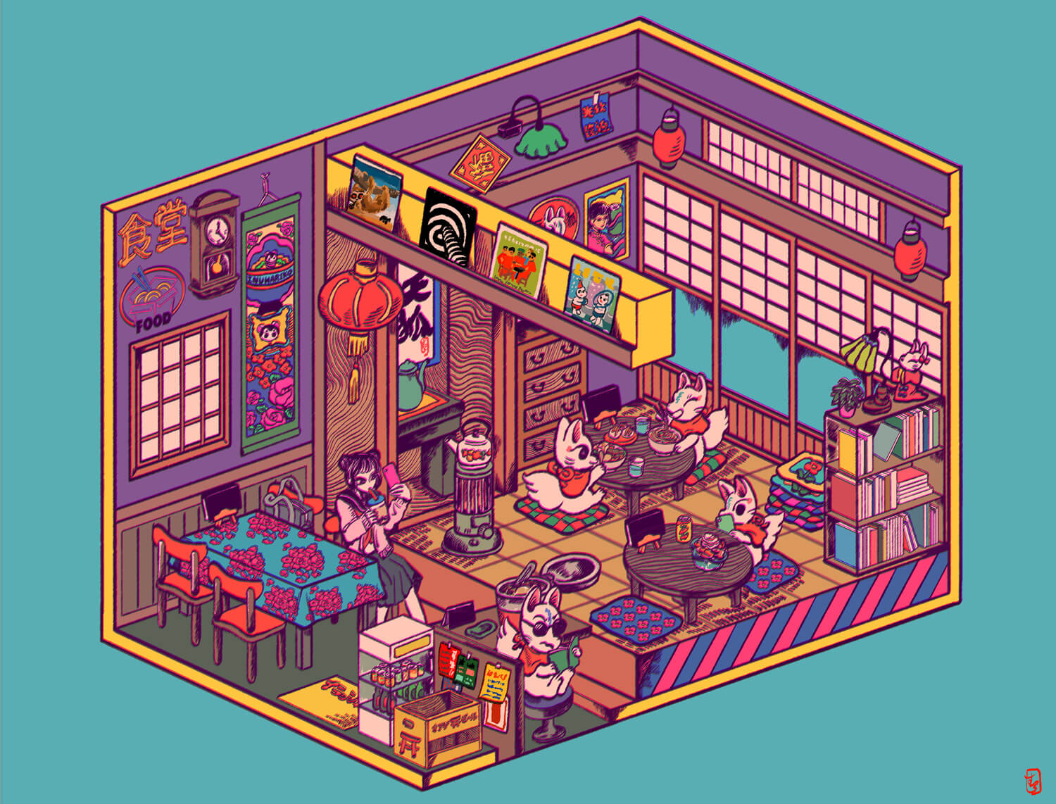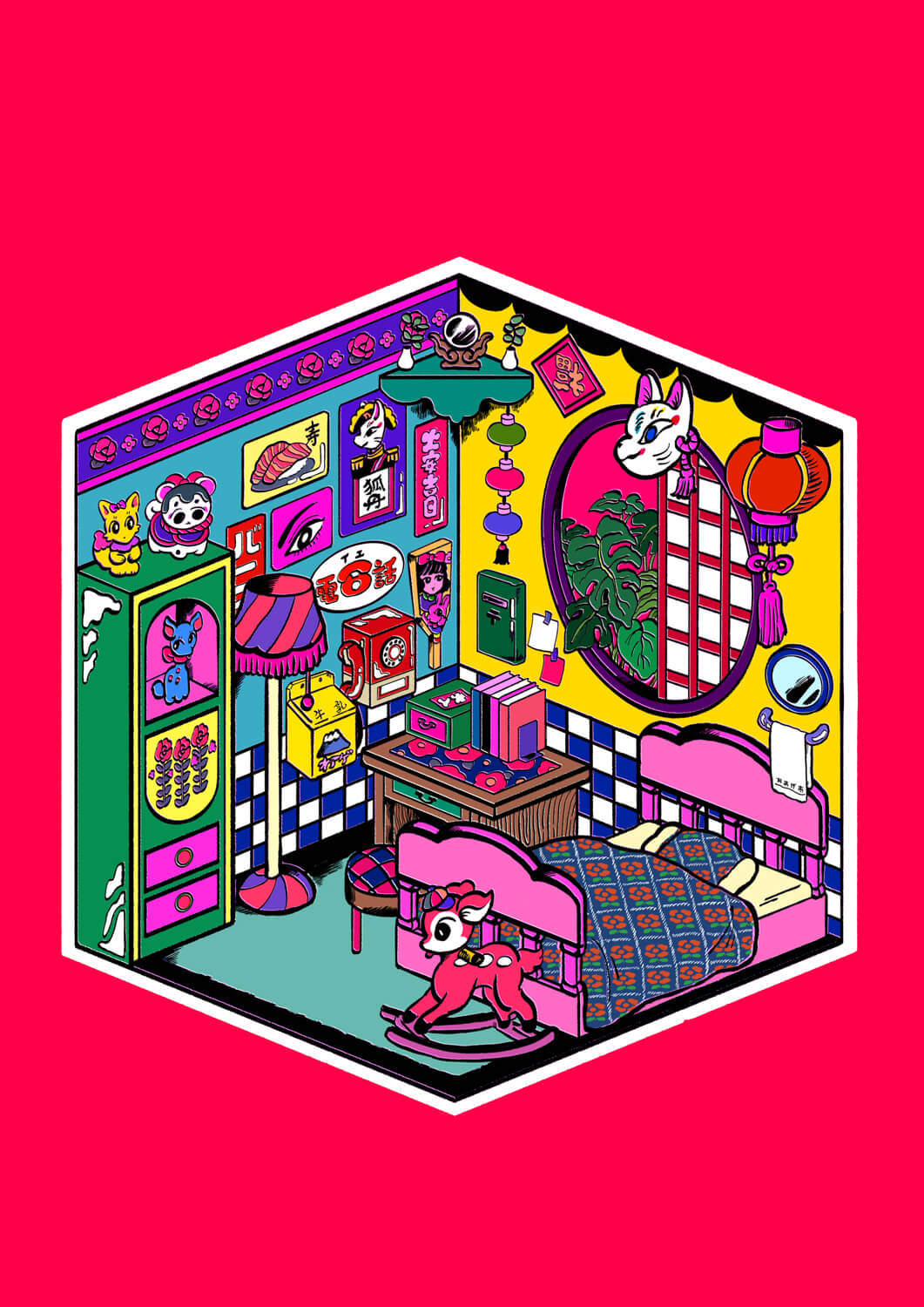 Par le biais de ces différentes plateformes numériques, on découvre ses traits grossiers mais maîtrisés, à travers lesquels la jeune femme illustre une certaine image d’un Japon des années 80, inspirée par son environnement actuel. Une ère durant laquelle les couleurs flashy régnaient aussi bien dans la mode que dans la décoration. Pour créer cette esthétique si particulière et affirmée, la jeune femme combine des outils numériques tels que Photoshop à des matériaux analogiques comme la gouache acrylique.
