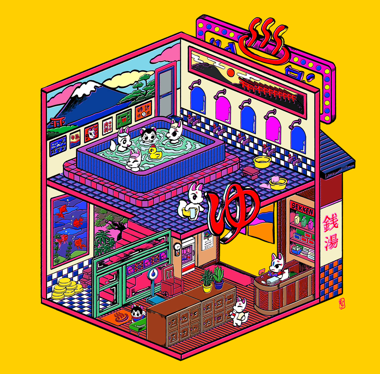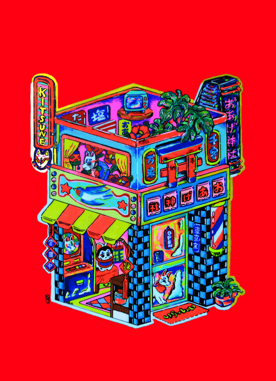 L’artiste nous ouvre donc les portes de son monde imaginaire, où elle rêve de magasins de jouets fictifs, de bains chauds ou encore de kissaten, qu’elle restitue à sa façon. Ses illustrations colorées au néon représentent principalement des boutiques, des chambres ou encore quelques portraits de la nouvelle génération. Chaque oeuvre se caractérise par des paysages surchargés et un nombre ahurissant de détails. Parmi ces derniers, on retrouve fréquemment des éléments traditionnels de la culture japonaise, à l’instar du renard ou des portes de sanctuaires Torii.