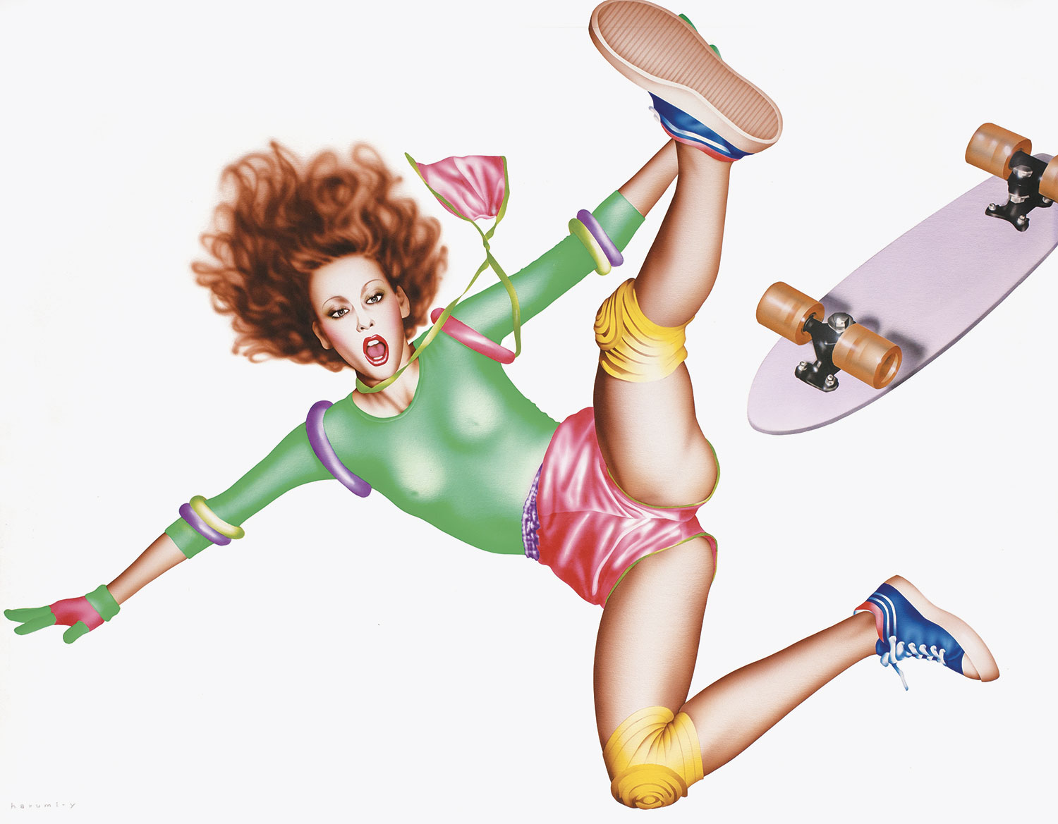 Des corps nus, aux formes voluptueuses, tantôt perchés sur des talons aiguilles, tantôt en train de se délasser dans une piscine ou sur le point de démarrer un combat de boxe, le tout sous un déluge de couleur pop’, les femmes qui prennent forme sur les toiles de l’artiste Harumi Yamaguchi détonnent. Leur plastique parfaite, flirtant avec l’érotisme, fut le moyen pour l’artiste d’accompagner le mouvement de libération des femmes dans les années 1970.