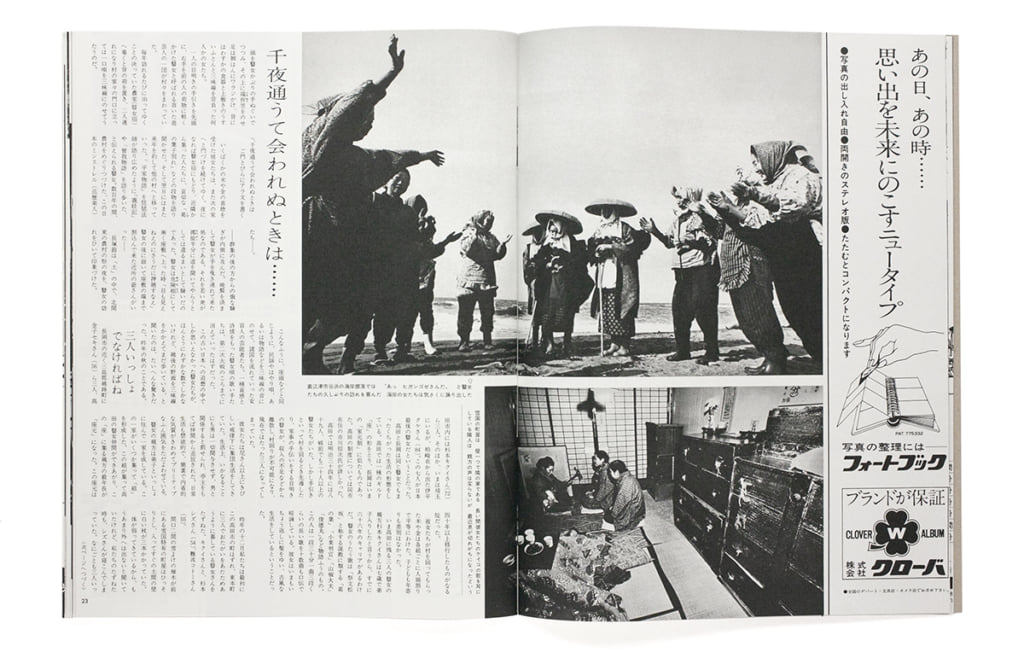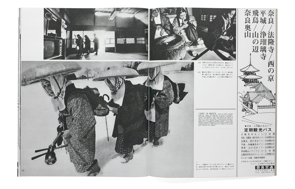 Entre 1970 et 1974, Shoko Hashimoto prend la route avec ces femmes, afin de partager et enregistrer leur vie de nomade, perpétuant une tradition vieille de plus de quatre siècles. Les articles reproduits montrent des femmes en souffrance qui, guidées par une femme voyante, faisaient étape dans des villages, où elles chantaient et jouaient du shamisen, un instrument de musique traditionnel à cordes pincées. En échange de leur performance, les villageois versaient aux goze du riz et de l’argent.
