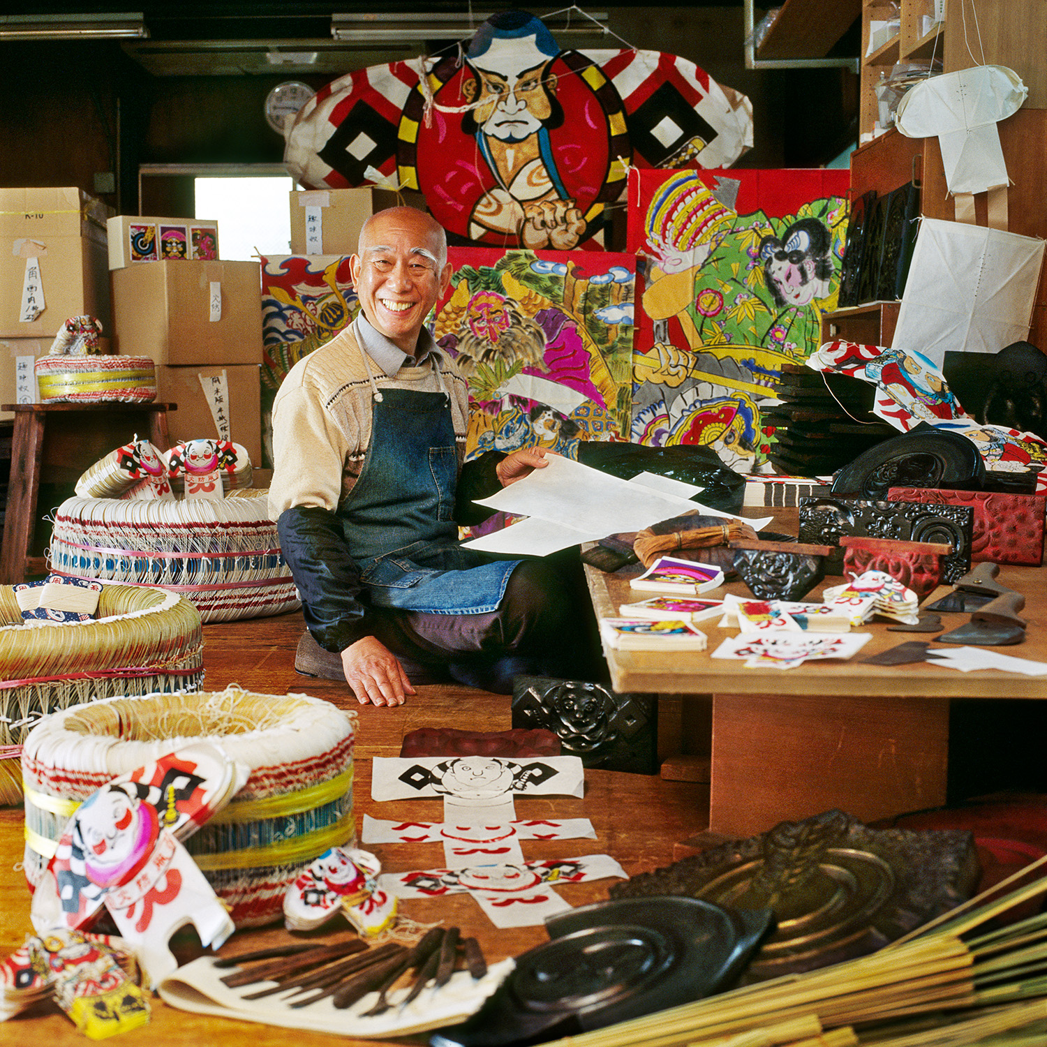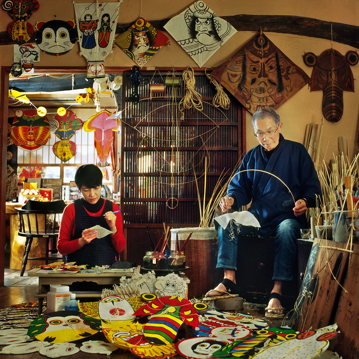 Autre portrait, celui de Takashi Ono dans son atelier, l’Ono-shō-tako-ten, situé à Edogawa-ku, dans la préfecture de Tokyo. Ici l’héritage familial apparaît à travers les couteaux posés au premier plan sur la table. Le grand-père de Takashi Ono, Shoji Ono, a grandi dans une famille travaillant dans la production de katsuobushi (une préparation de bonite), et utilisait ces couteaux à lame incurvée pour graver les planches de bois servant à imprimer en série le décor de ses cerfs-volants.