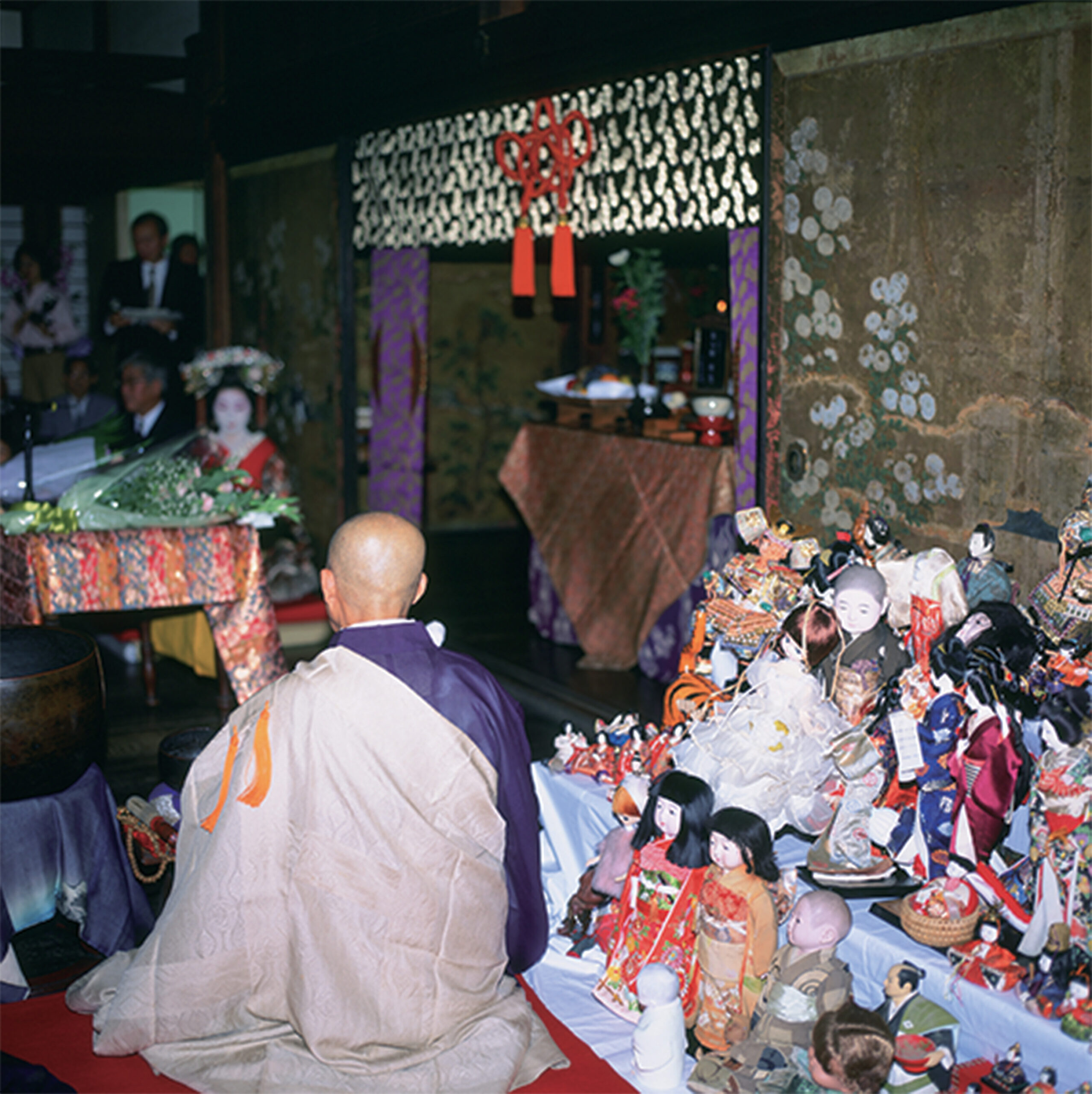 Cérémonie de “ningyō kuyō” (rite funéraire pour poupées), organisée chaque année en octobre au Hōkyō-ji, à Kyoto, également connu sous le nom de « temple des poupées ». © HIROSHI MIZOBUCHI / SEBUN PHOTO / amanaimages