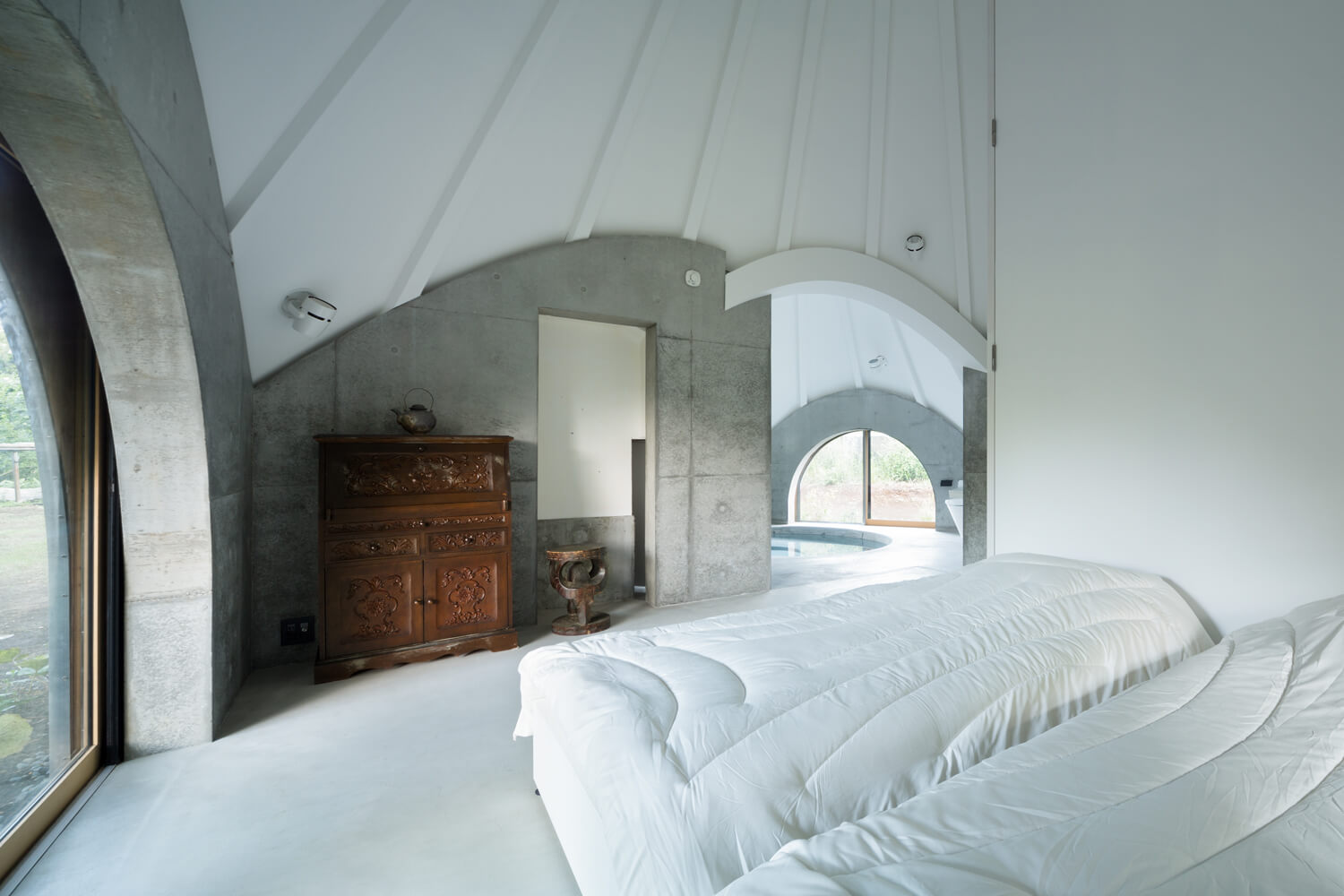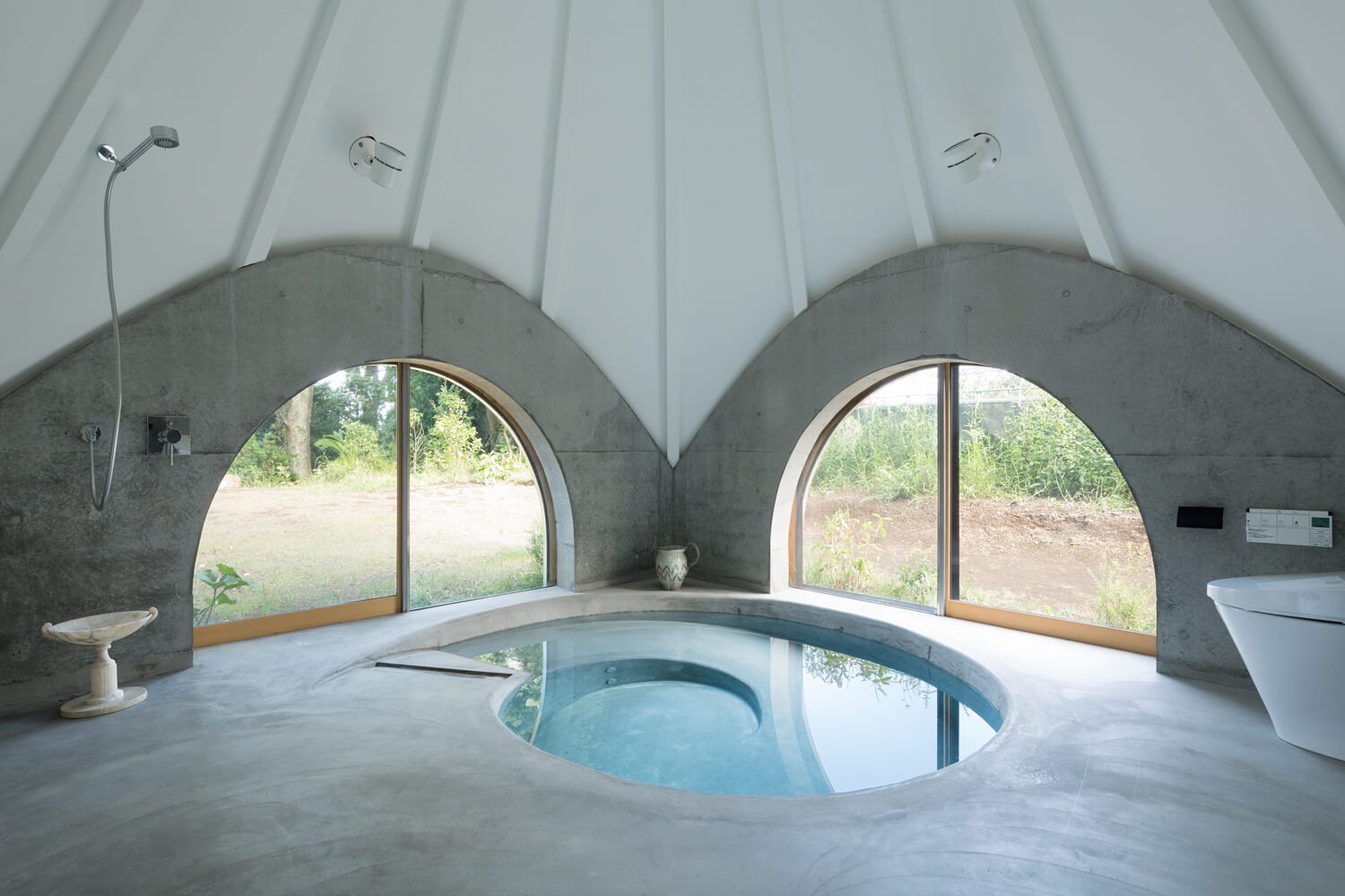 Un projet vertueux donc, qu’Issei Suma a pensé « comme quelque chose de fort, comme une hutte primitive, mais aussi de doux et saint, comme une chapelle ». Avec leur hauts plafonds au sommet percé d’une fenêtre afin de baigner le plus possible dans la lumière naturelle, les tipis ont aussi été pensés pour offrir le plus d’ouvertures possibles sur la nature environnante. Leur bardage extérieur de bois tend à les fondre dans le paysage, tandis que leur intérieur, tout en béton, leur confère un côté très moderne.