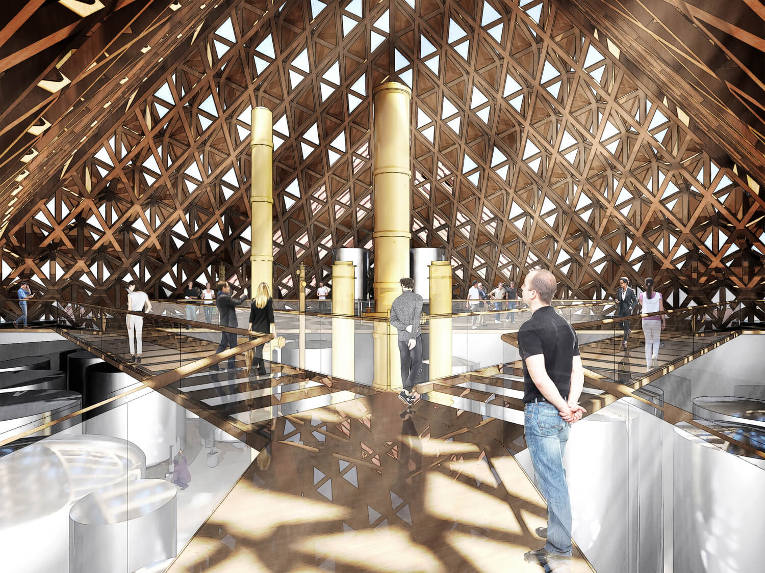 Les trois pyramides que l’architecte propose au groupe Stoli devraient s’accompagner de nouveaux entrepôts destinés au vieillissement du whisky et s’inspirent, dans leur forme extérieure comme dans les détails de leur intérieur, des bâtiments industriels traditionnels du XIXème siècle. L’acier, matériau privilégié d’alors, est remplacé par le bois (dans un souci environnemental mais aussi esthétique, pour une meilleure adaptation au paysage). Et si les trois pyramides se ressemblent, chacune d’entre elles a sa particularité : la première pyramide est entièrement vitrée, la deuxième est à moitié vitrée et à moitié recouverte d’éléments opaques et la dernière est principalement recouverte d’éléments opaques avec quelques éléments vitrés.