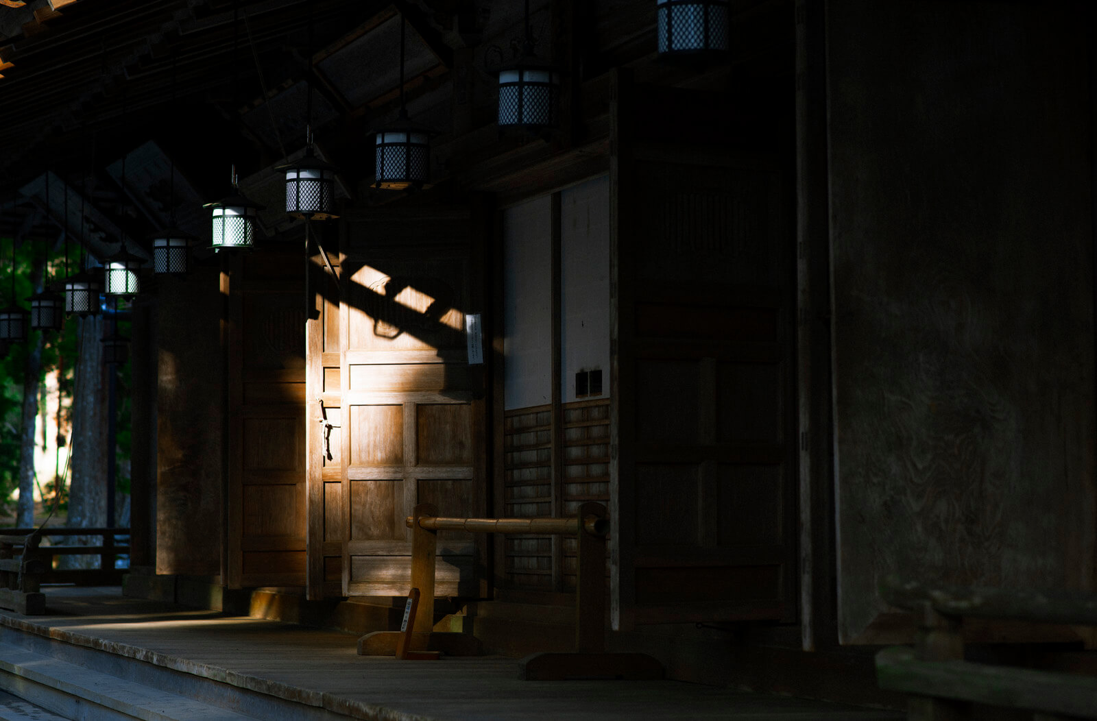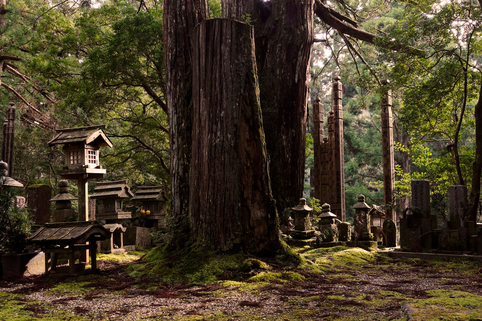 Kukai prit lorsqu’il entra dans un l’état de méditation profondedit maitre ya, le nom de Kobo Daishi, et c’est ici qu’il vit et médite toujours, au bout d’un chemin long d’un peu plus de deux kilomètres, magnifique passage bordé de part et d’autre d’arbres tous plusieurs fois centenaires et de milliers de tombes – on en compte 200 000 au final pour ce qui est le plus important cimetière du Japon – dont certaines abritent les cendres de puissants, politiciens, entrepreneurs, guerriers… tous désireux de reposer à proximité du défunt moine. Par l’impression de beauté et de solennité qui s’en dégage, par son atmosphère aussi, qui se prête au songe, à l’introspection, le lieu justifierait à lui seul le long voyage. On y est comme hors du temps, transporté dans un ailleurs plein de quiétude, seul au monde ou presque. L’entrée se fait par le pont Ichinohashi, puis, deux kilomètres plus loin donc, arrive le Okunoin, littéralement « temple de l’extrémité », refuge éternel de Kobo Daishi depuis sa disparition en 835. Jour après jour depuis bientôt 1300 ans, celui-ci reçoit de ses fidèles des repas soigneusement préparés à base de riz, de bouillon au miso, de nouilles udon ou soba, de tofu ou encore de fruits – une cuisine végétarienne comme l’est celle servie dans les nombreux temples qu’héberge la montagne sacrée.
