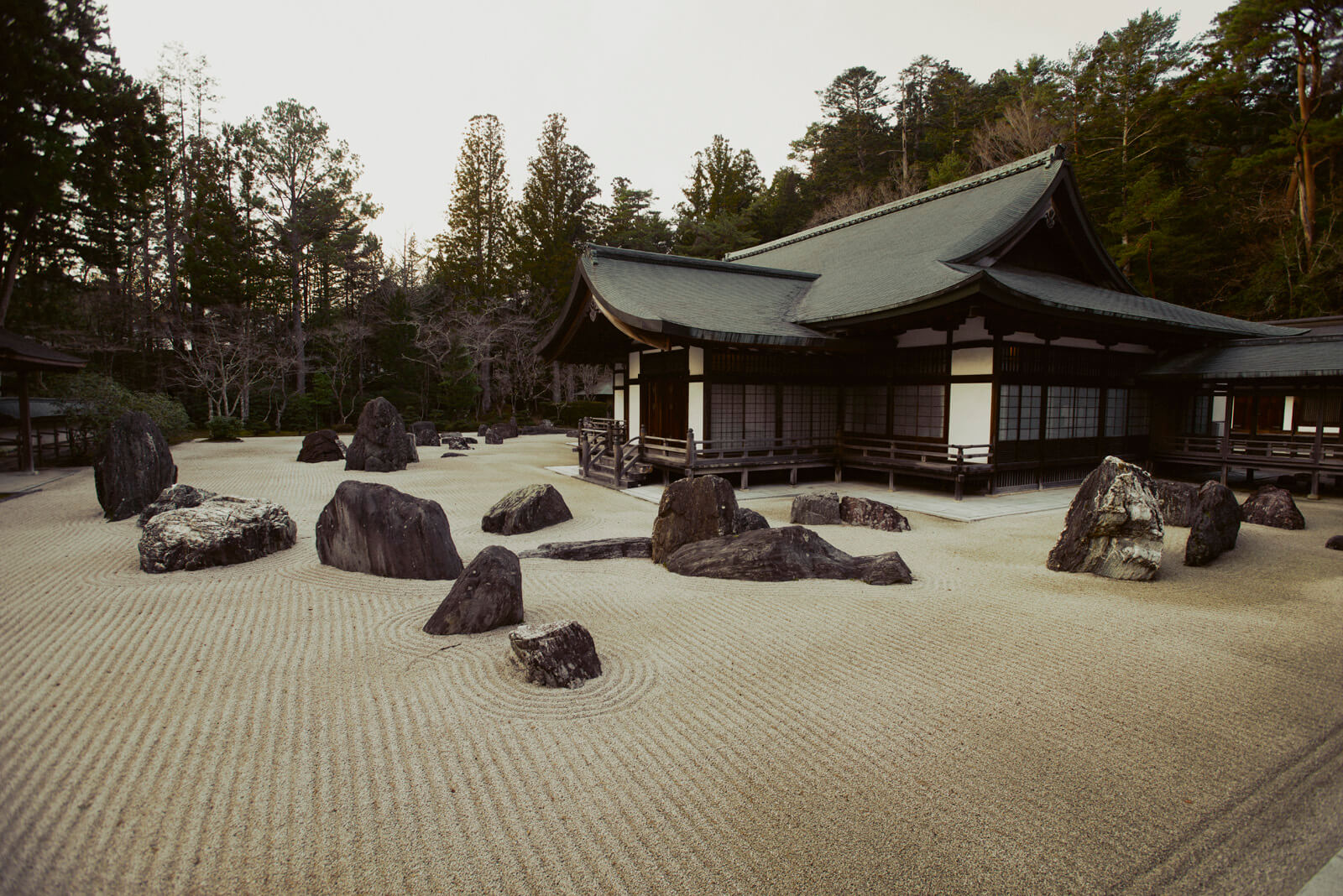 Depuis l’aéroport du Kansai, ce sont les lignes de la compagnie Nankai qui nous conduisent, jusqu’à Namba d’abord, au cœur de la trépidante Osaka, puis jusqu’à Hashimoto via la ligne Nankai-Koya. Faute de funiculaire, indisponible jusqu’au début du printemps, c’est en bus que se fait la dernière partie du trajet avec ses lacets qui ravissent par le spectacle qu’ils nous offrent. Puis vient l’arrivée, àprès de 1000 mètres au-dessus du niveau de la mer. C’est en 805 que s’installa ici Kukai, moine bouddhiste parti deux ans en Chine étudier les fondements d’un bouddhisme ésotérique, le Shingon. À son retour, il fonde le Kongobu-ji, premier et plus important des temples d’une montagne qui en compta jusqu’à deux mille. La légende raconte que c’est à un lancer de sanko, une sorte de harpon à trois têtes, utilisé dans les cérémonies bouddhiques, et à deux chiens, l’un noir, l’autre blanc, qu’il dut son choix du mont Koya. On ne s’étonnera pas donc de retrouver ces symboles, le sanko et les deux chiens, en de multiples endroits.