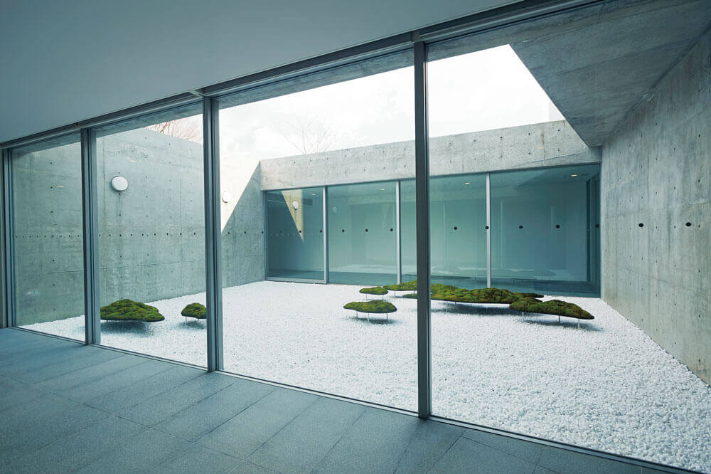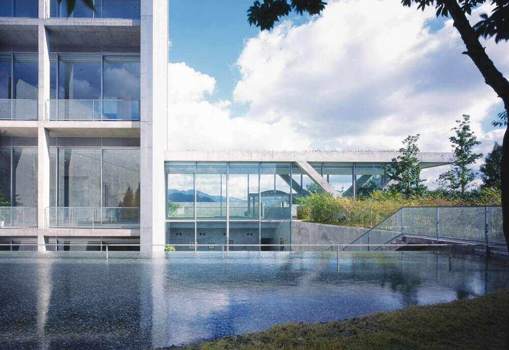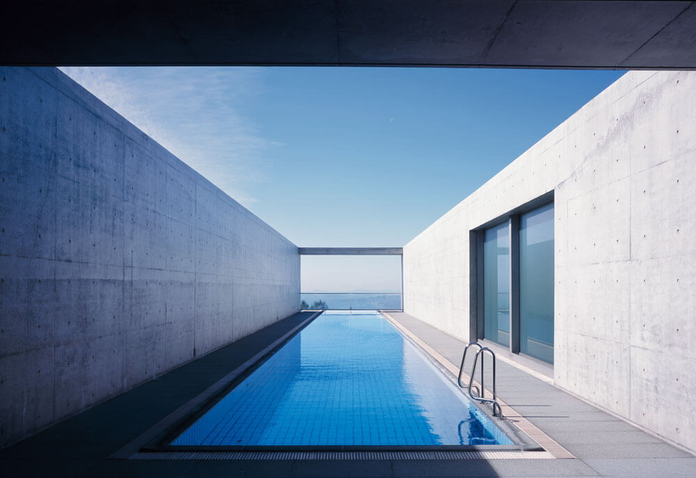 L’intérieur du bâtiment crée un espace<< sans frontières>> entre l’intérieur et l’extérieur, offrant une vue magnifique sur la mer Intérieure. Profitez de cette perspective unique en goûtant aux produits saisonniers de la préfecture d’Ehime dans de la vaisselle Tobe-yaki. Ando a fait du milieu environnant un allié. Sa vision est symbolisée par la piscine couverte construite en direction de la mer. Encerclée par les montagnes, cette dernière connaît de longues périodes de calme (nagi en japonais) durant lesquelles la surface de l’eau étincelle comme un miroir. En plongeant dans la piscine, vous pourrez vous connecter avec cette mer de tranquillité.