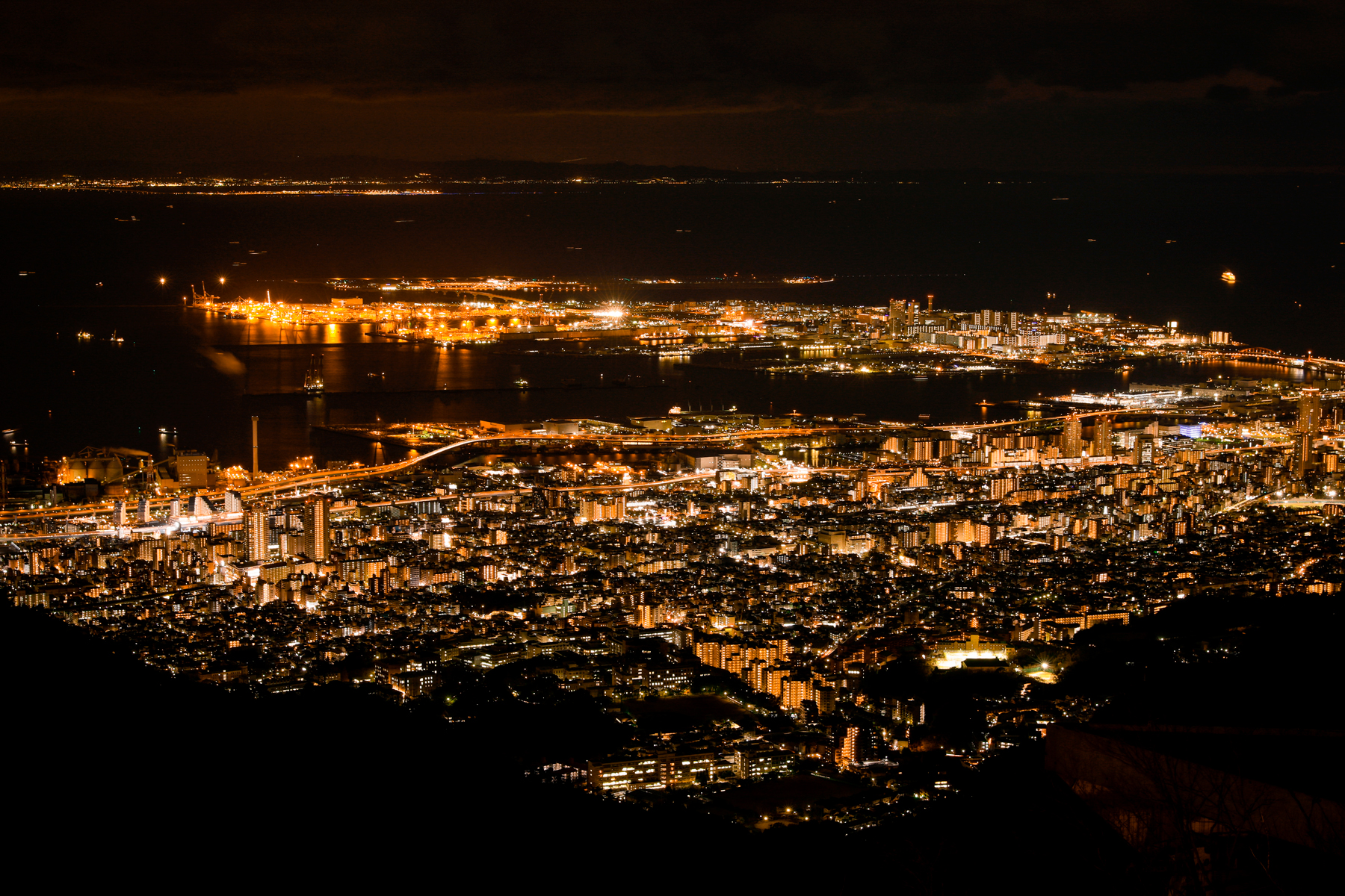 Vue panoramique depuis Tenrandai, sur le mont Rokko. À 737 mètres d’altitude, le regard embrasse Kobe et s’étend jusqu’à Osaka et Wakayama.