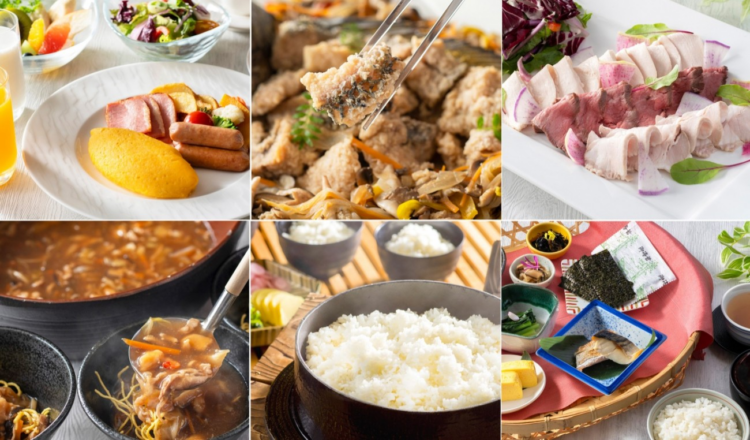 À gauche : Buffet du petit-déjeuner mettant en valeur des ingrédients locaux de Hyōgo. / À droite : Depuis les étages supérieurs, la vue s’étend au sud vers la baie d’Osaka et au nord vers l’aéroport d’Itami et la région de Hokusetsu.